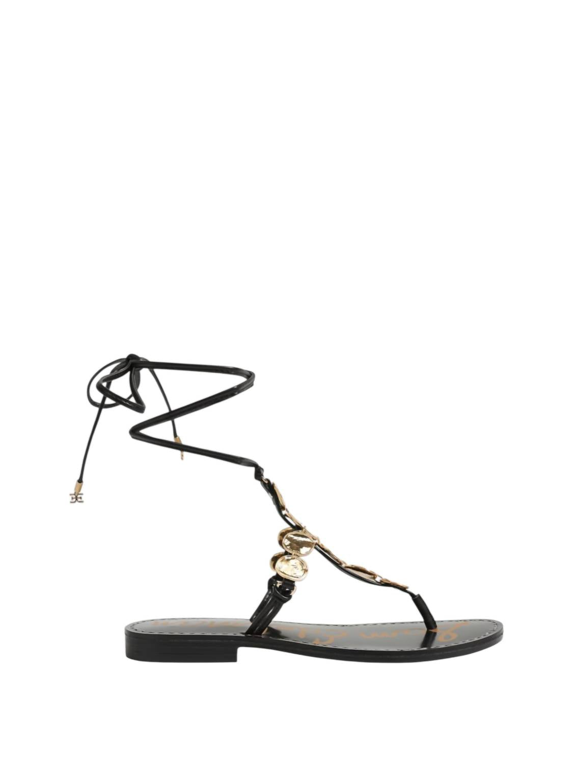 This sandal will take you from brunch to dinner and everything in between. Introducing the Women's Deirdre Wrap Sandal by Sam Edelman, a chic addition to your summer wardrobe with minimalist flair. These strappy sandals feature a lace-up closure and a sleek open toe design, crafted with synthetic materials complemented by a luxurious leather insole for comfort. The flat heel, measuring 0.75 inches, offers both style and ease for vacation-ready outings under the sun. The delicate stone accents and logo charm detail make these sandals perfect for pairing with an airy coverup or a patio-ready maxi dress.