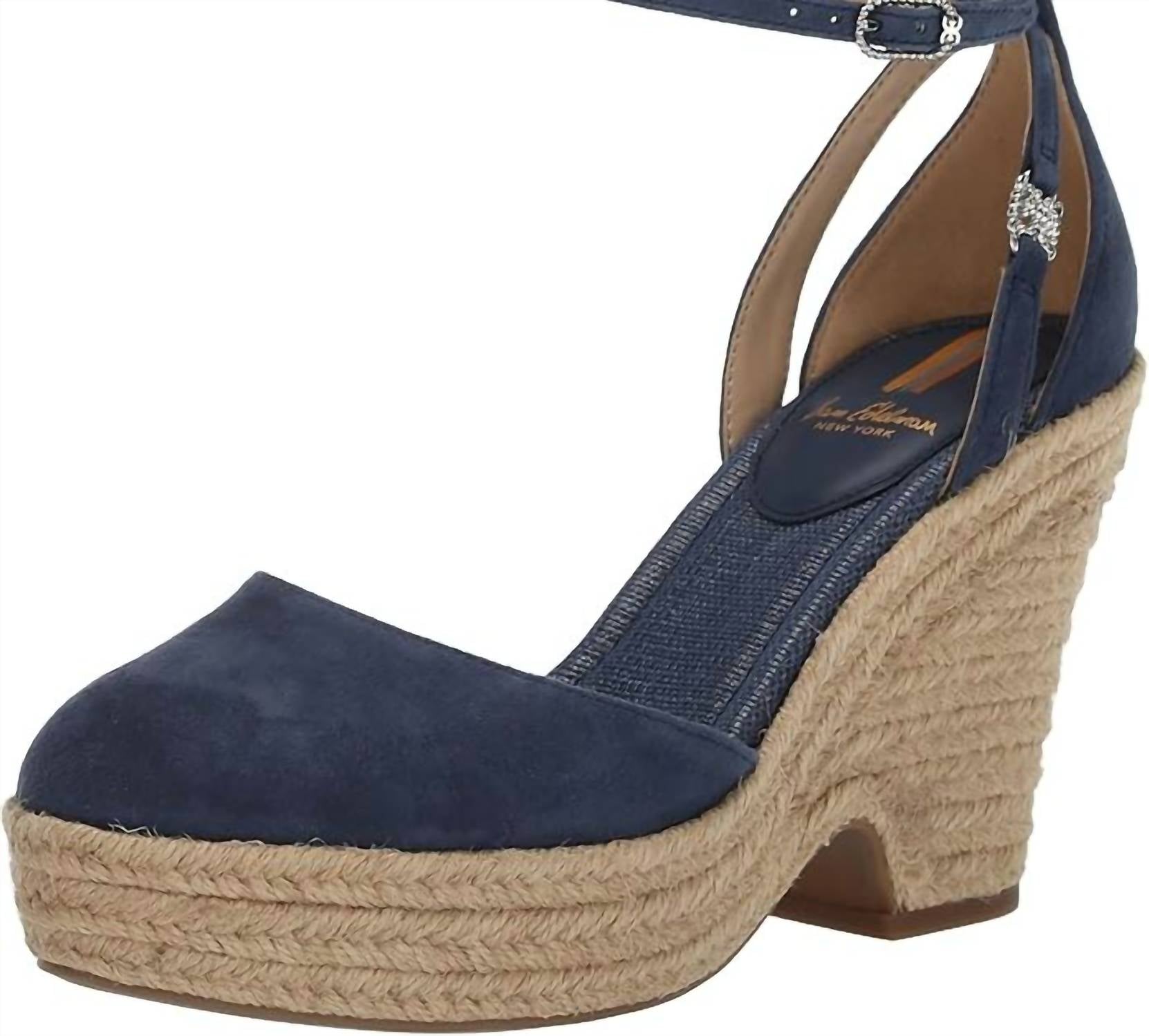 Flowy dresses, cropped pants, and even jumpsuits... this sandal works with them all! Step out in style with the Women's Nati Espadrille Wedge Sandal by Sam Edelman, a perfect blend of comfort and chic design. Featuring a sleek 4.3-inch wedge heel and a 1.1-inch platform, this sandal is made from a combination of fabric and leather in stunning Hudson Blue. The round toe and delicate ankle strap enhance its Boho Chic appeal, making it ideal for summer vacations. Closure is a secure buckle, and the synthetic insole ensures lasting comfort.