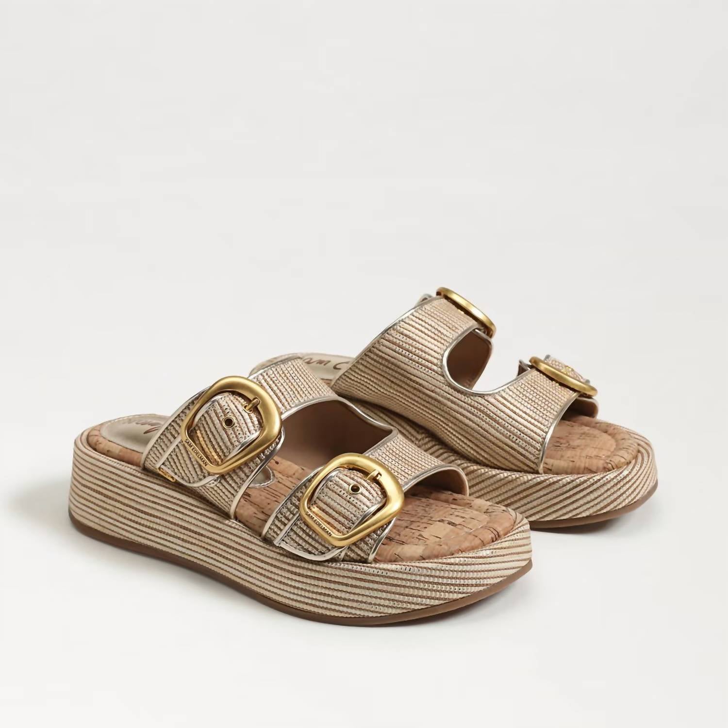 Flowy dresses, cropped pants, and even jumpsuits... this sandal works with them all! Embrace bold simplicity with this stylish slide sandal, featuring an oversized buckle detail and a textured sole that adds a modern edge to any casual look. Designed with a round toe and a comfortable synthetic insole, it offers both fashion and ease. With a 1.625-inch heel, this sandal is perfect for off-duty days when you want to make a subtle statement without sacrificing comfort.