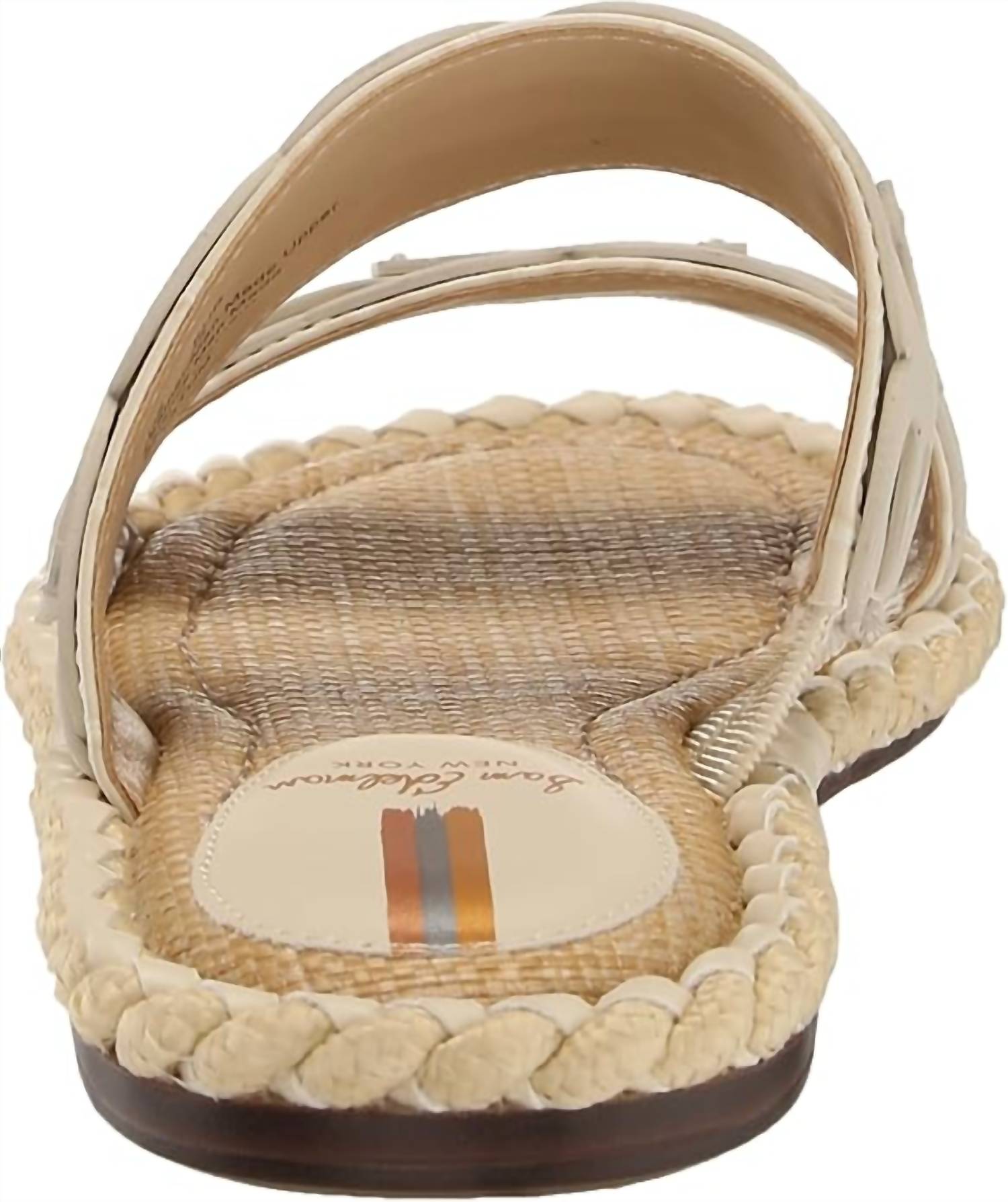 This sandal will take you from brunch to dinner and everything in between. Elevate your summer style with the Women's Tatum Flat Sandal by Sam Edelman in Modern Ivory. These sandals feature a chic leather and synthetic material composition with a double strap design, complemented by an open toe silhouette. Experience comfort with a synthetic insole and effortless wearability with the slip-on closure. The rustic rope trim and luxe equestrian-inspired style offer a perfect vacation-ready addition to your wardrobe, all while maintaining a minimalist trend. Heel height: 0.37 inches.