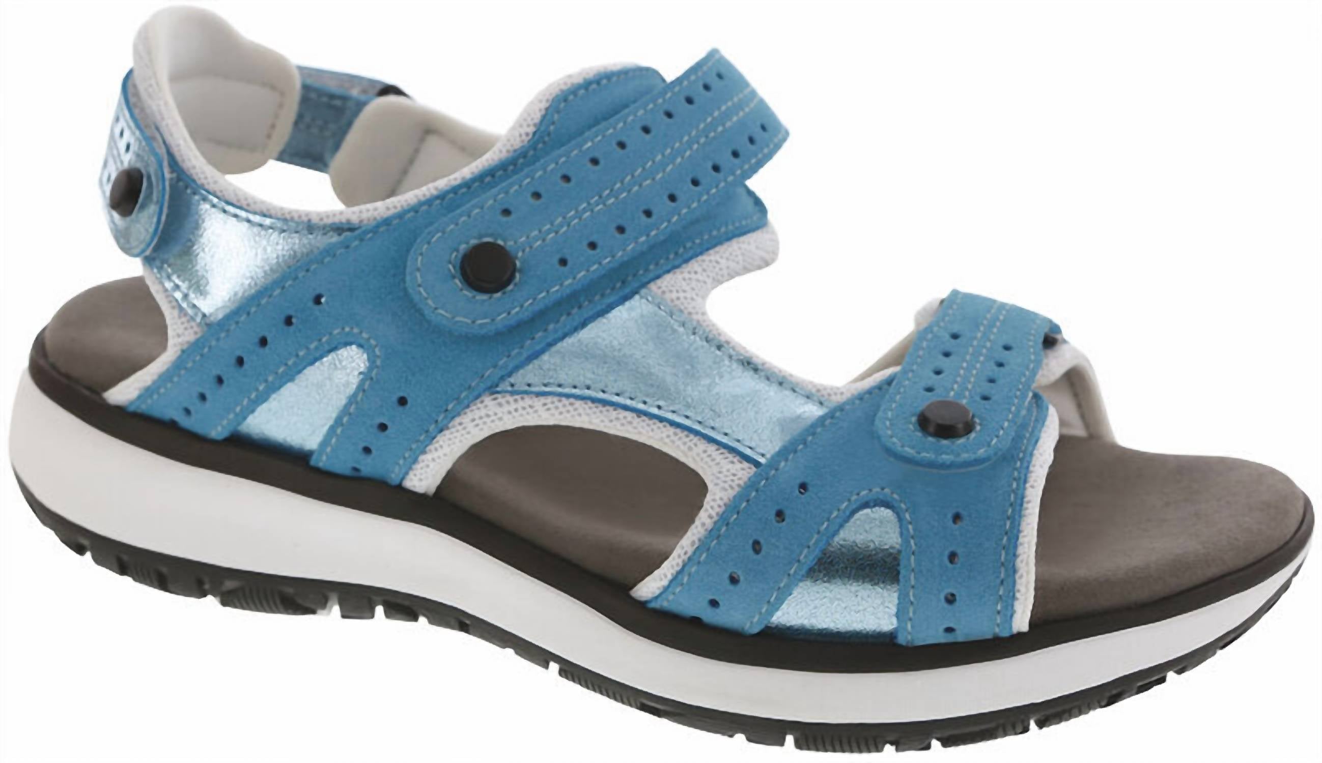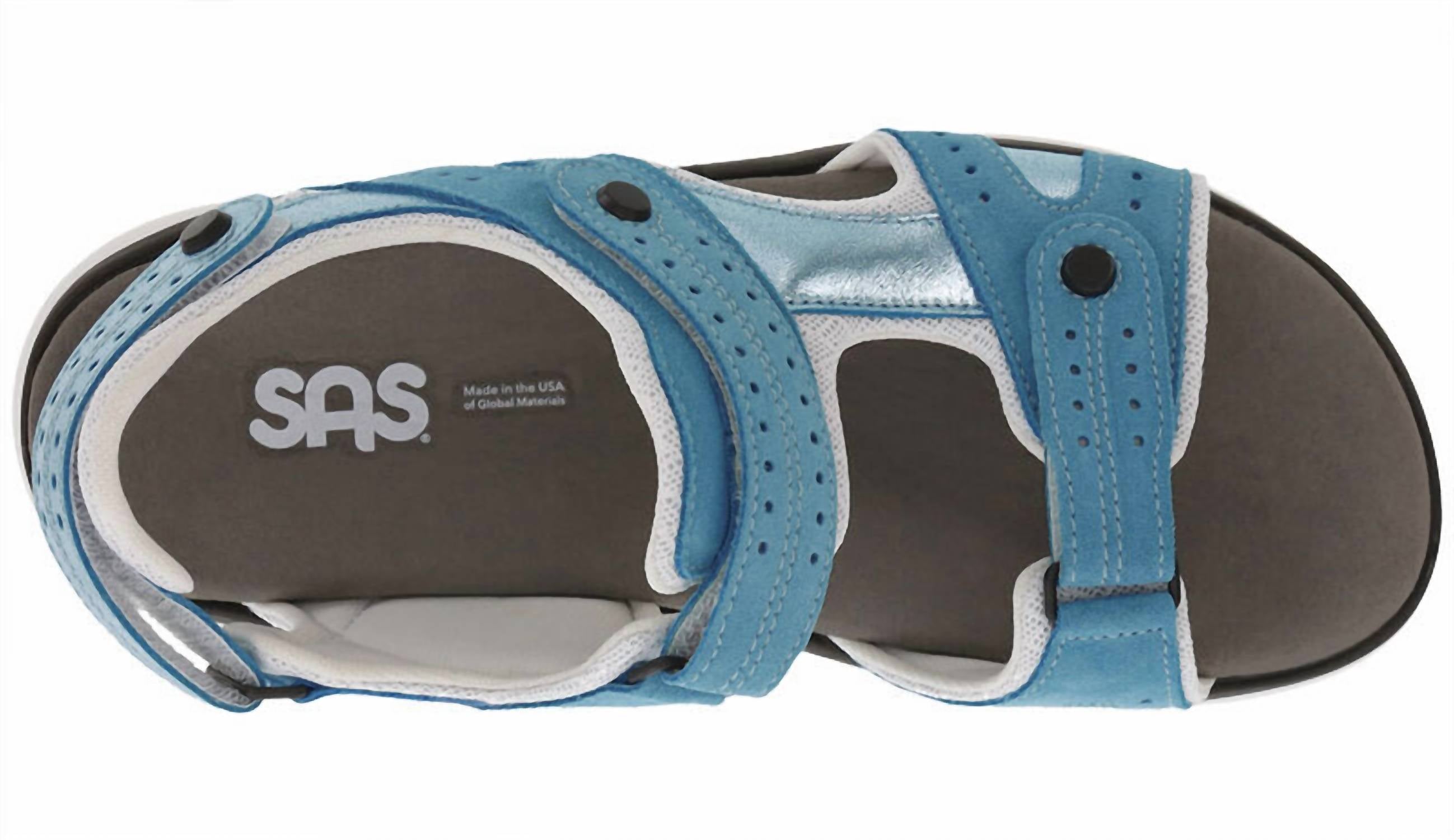 Introducing the Women's Embark Ltd Sport Sandal by SAS, an ideal choice for any adventure in a trendy baltic hue. This sandal features adjustable hook and loop straps for a secure, personalized fit and a dual density contoured molded insole with supersoft microsuede for ultimate comfort. Enjoy a stable stride with its dual density outsole composed of an EVA midsole and rubber outsole designed for durability and traction. Elevate your summer streetwear and travel wardrobe with its low 1.75" flat heel, perfect for a variety of activities.