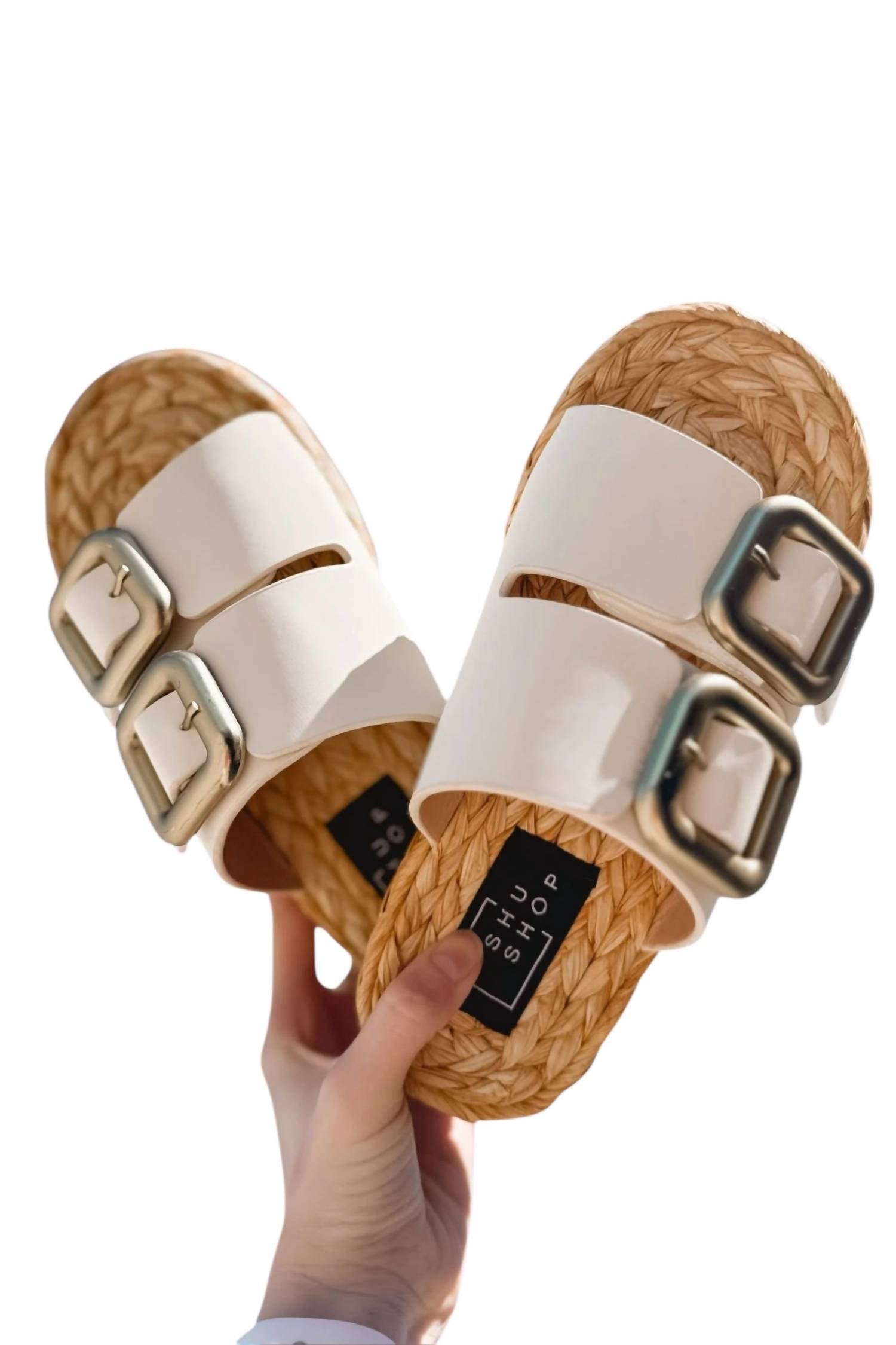 Flowy dresses, cropped pants, and even jumpsuits... this sandal works with them all! Introducing the Billie Sandal by SHU SHOP, blending comfort and sophistication in a chic design. This Ivory sandal features double straps crafted from soft faux leather, adorned with bold gold-tone buckles for a statement look. The woven jute sole complements its natural charm, complete with a subtle wedge effect for a touch of lift. Perfect for versatile outings, this flat-heeled sandal effortlessly transitions from relaxed beach walks to urban adventures.