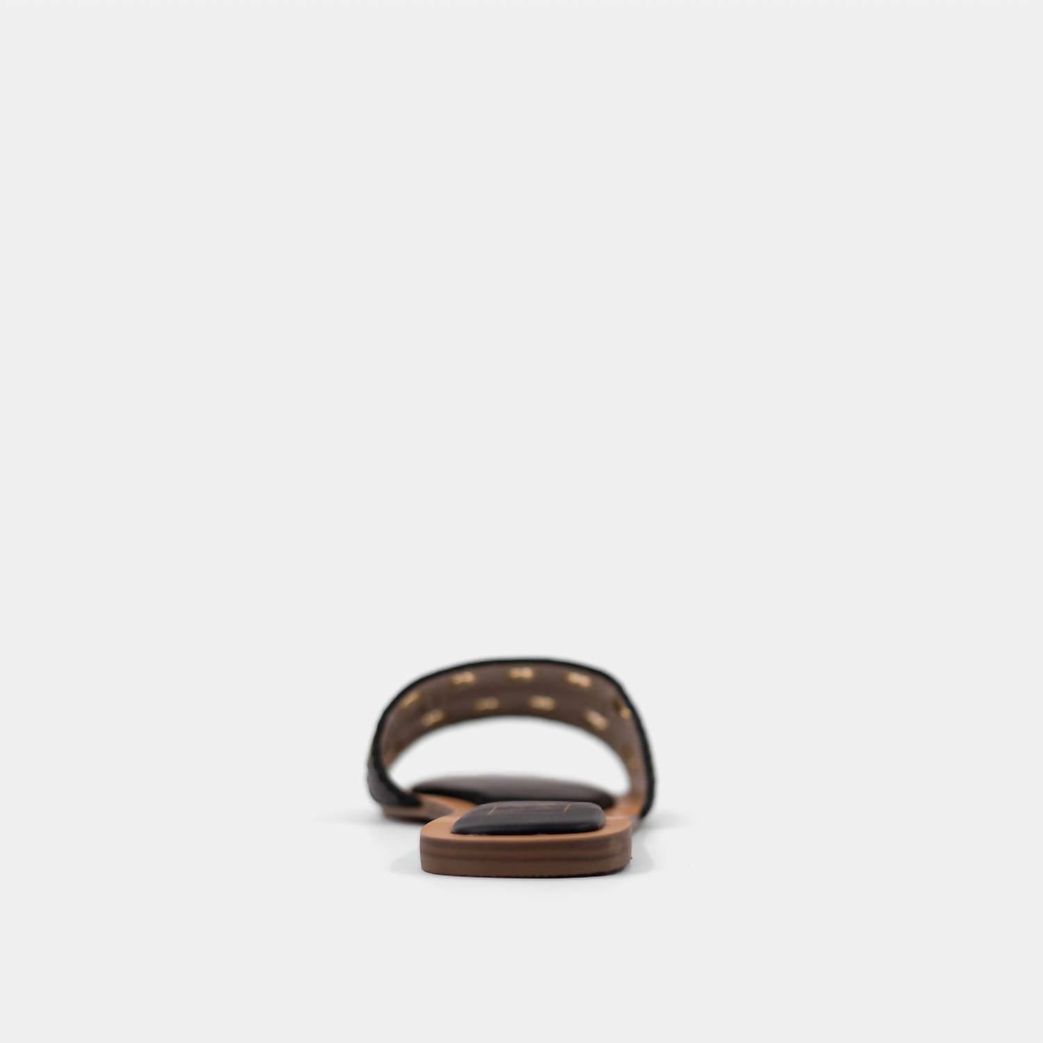 Classicly cute and all-day-wearable. We love this sandal. Elevate your summer style with the Women's Codie Black Gold Sandals by SHU SHOP, a boho chic addition to any wardrobe. Made from smooth faux leather, these open toe sandals are adorned with oversized gold eyelets for a bold, contemporary look. Featuring a flat heel for everyday comfort, they are perfect for vacation getaways or adding flair to your New Year's Eve ensemble. The padded insole ensures all-day comfort, making them a practical yet fashionable choice for modern chic outfits.
