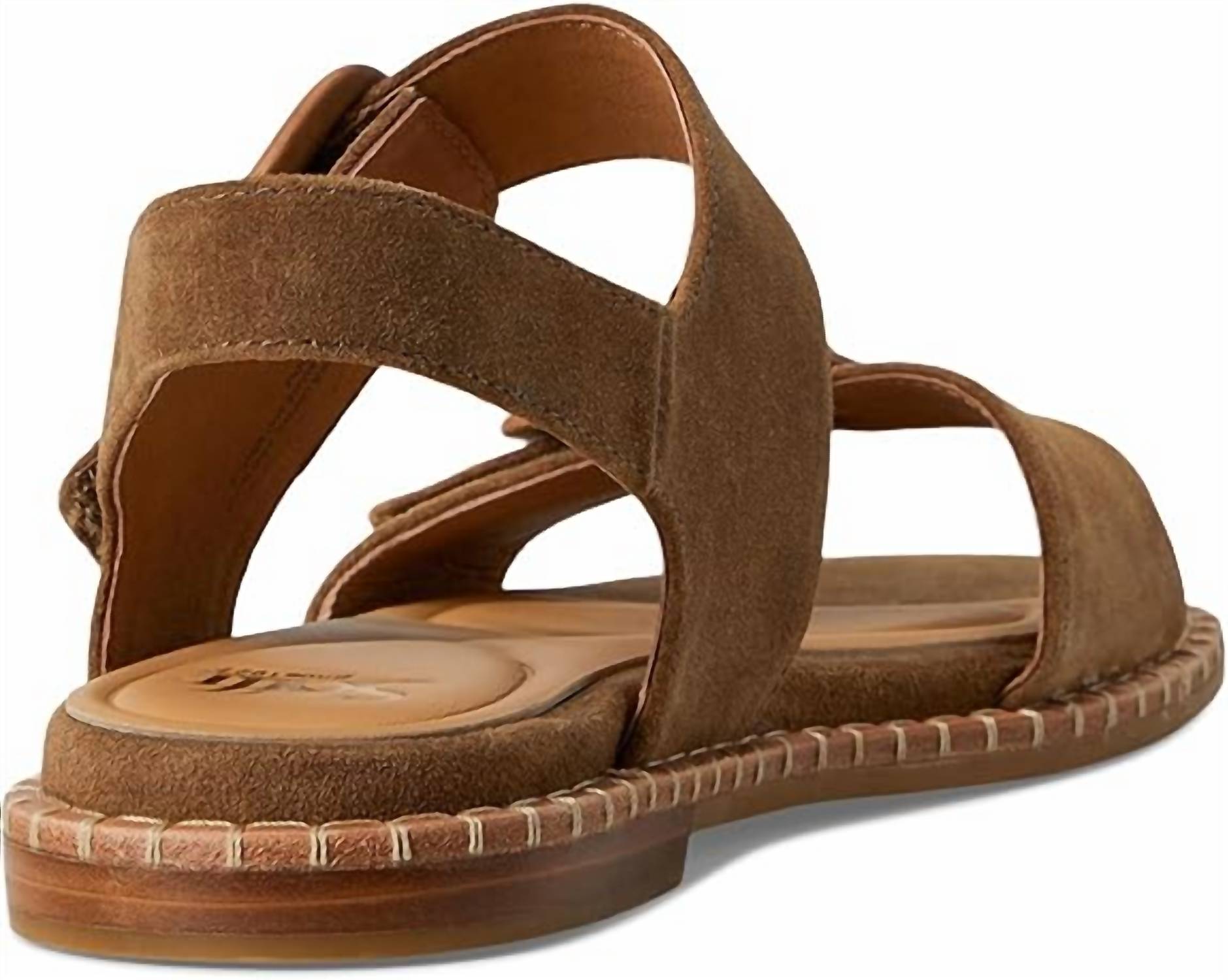 The Women's Napa Sandal by Sofft seamlessly merges style with comfort in a minimalist design ideal for vacation wear. Crafted from rich Italian suedes in a sophisticated oak brown hue, these sandals feature buckle accent straps with a convenient hook-and-loop closure for a custom fit. The round toe design houses a leather-lined footbed cushioned at the ball, heel, and arch, offering exceptional comfort. The flexible, slip-resistant TPR outsole is complemented by a blanket-stitched leather welt and a subtle stacked heel measuring .75 inches, providing stability with every step.