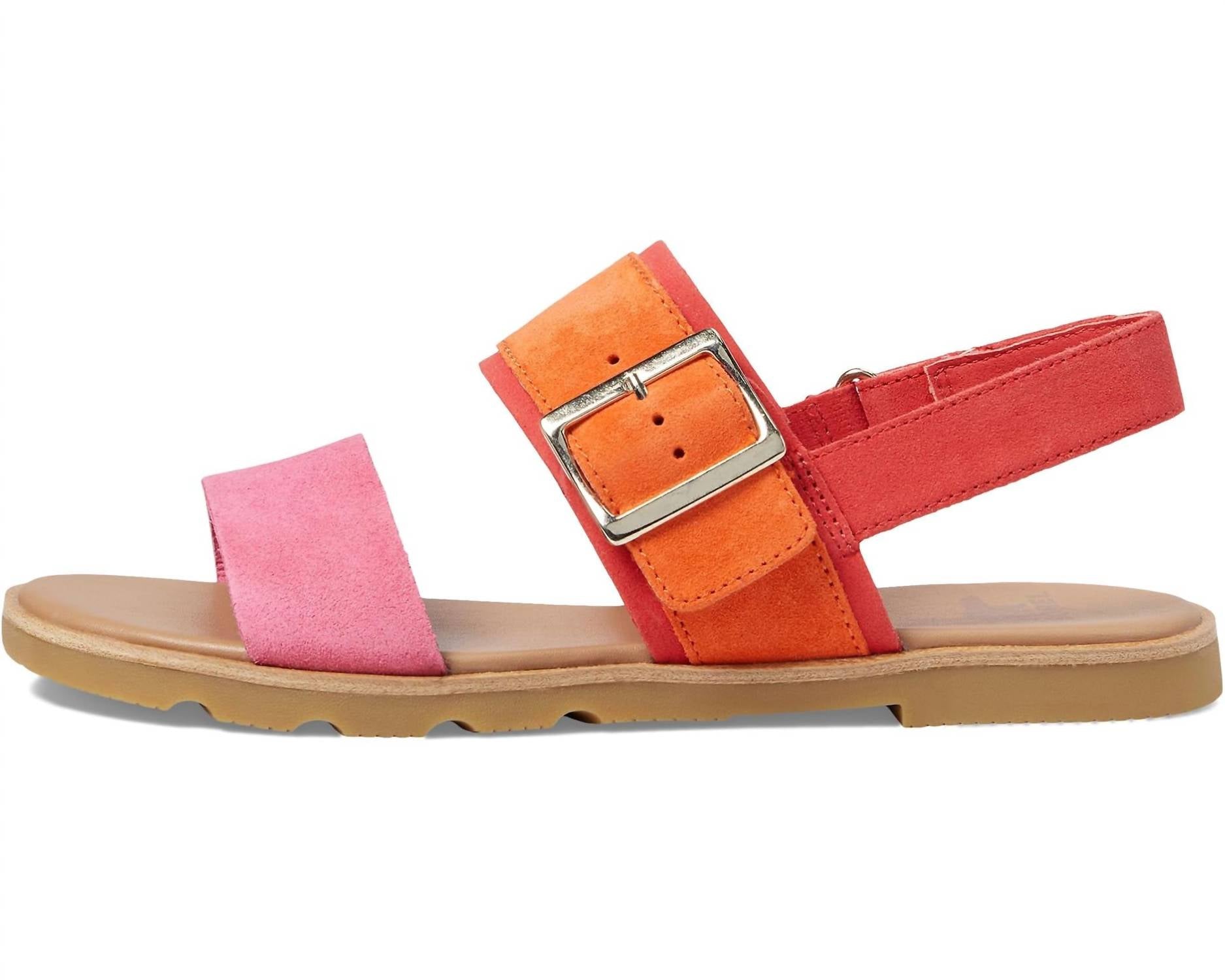 Classicly cute and all-day-wearable. We love this sandal. Experience all-day comfort and style in a striking red hue. Feature an upper available in options like full grain leather, suede, and metallic finishes, accented by a chic buckle detail. Footbed is crafted with PU-like EVA foam for exceptional comfort, coupled with a synthetic topcover. Rubber cupsole with reverse bob SOREL DNA delivers lasting durability. Open-toe design with a flat heel style and a platform height of 3/4 inches makes it perfect for day-to-night transitions.