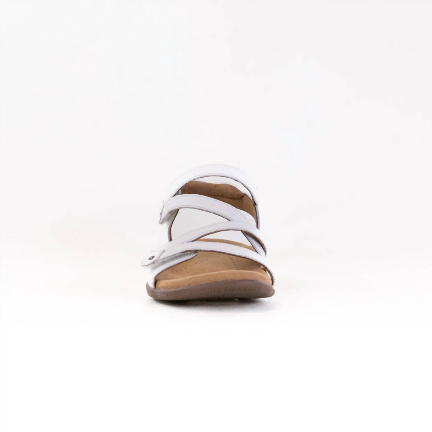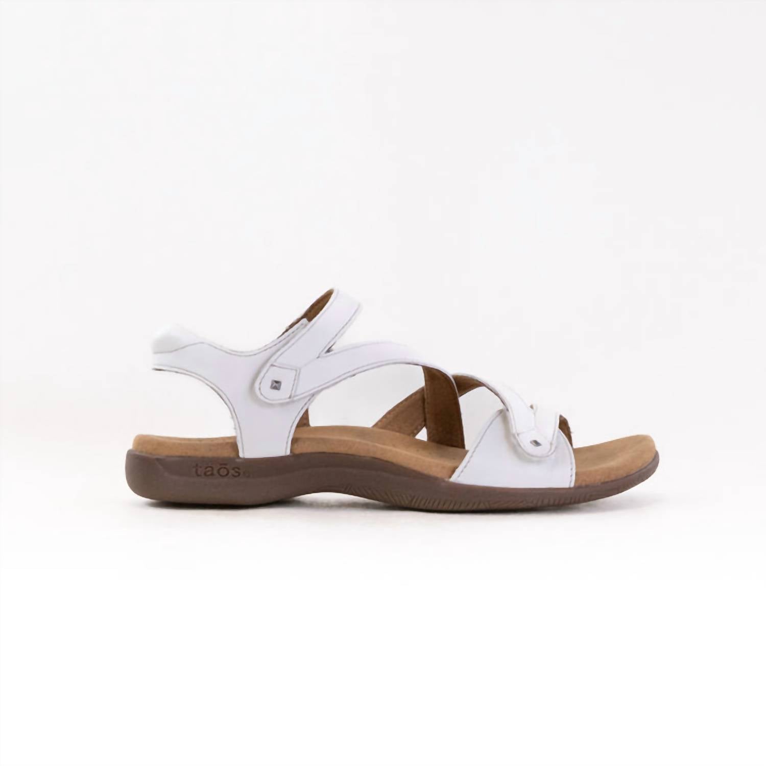 Flowy dresses, cropped pants, and even jumpsuits... this sandal works with them all! Step into comfort and style with the Women's Big Time Sandal by Taos, featuring a white leather upper and an open toe design. These sandals are perfect for summer adventures, offering adjustable hook and loop closures and a supportive Soft Support™ insole with arch and metatarsal support. The sandals are lined with breathable microfiber and treated with an antimicrobial shield for freshness. Heel height is 3/4", with a flexible rubber outsole for durability. Care is simple: buff with leather cleaner or polish and wipe with a dry cloth.