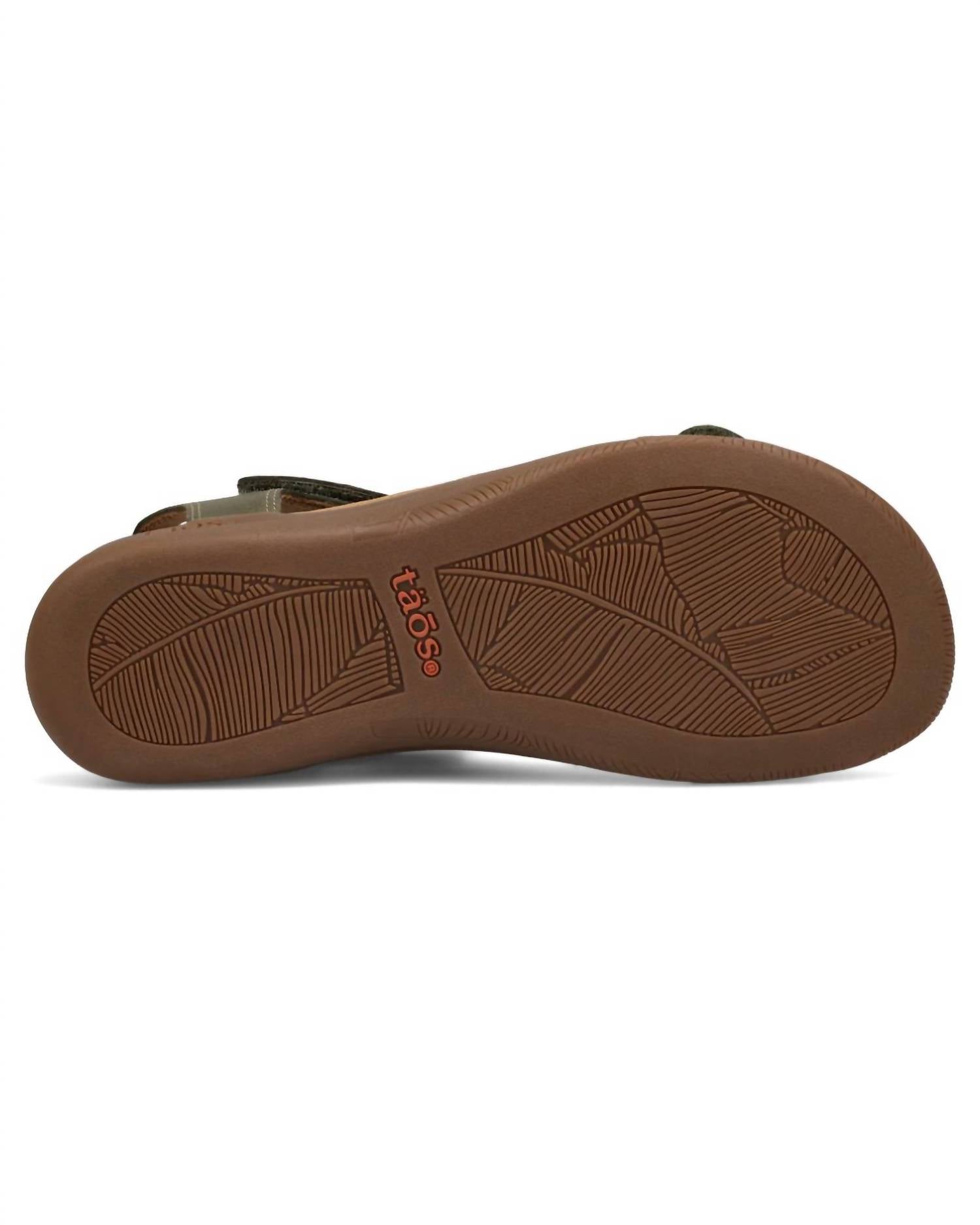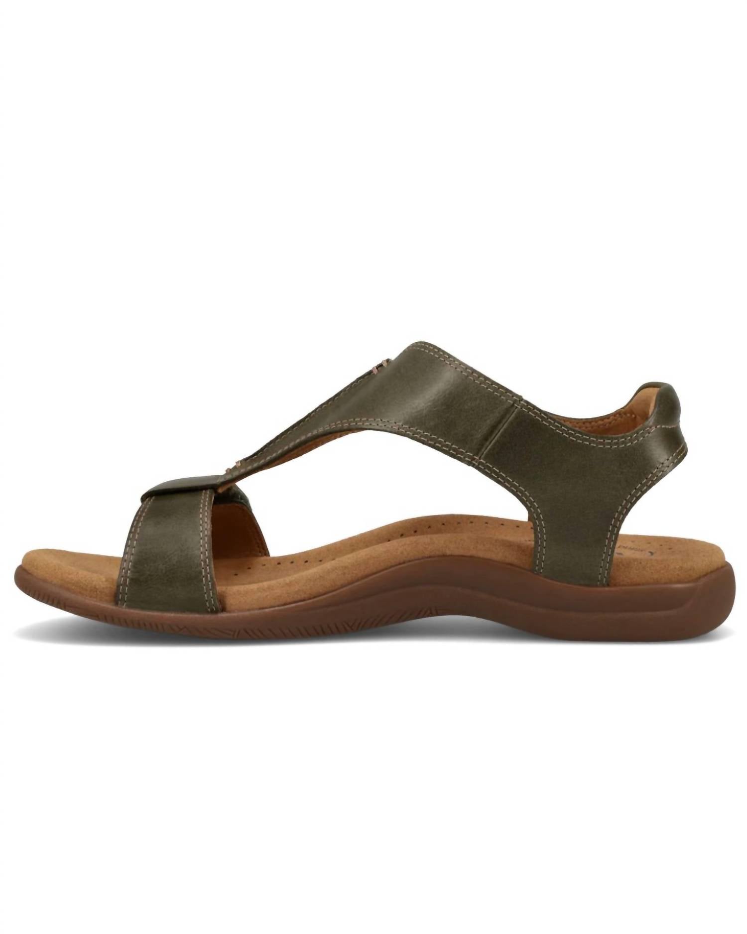 This sandal will take you from brunch to dinner and everything in between. Step into elegance with the Women's Show Leather Sandal by Taos, crafted from premium Italian-imported leather in a striking olive shade. This sandal features a classic t-strap design with two adjustable hook-and-loop straps, ensuring a secure and comfortable fit. The embossed microfiber footbed is treated with an antimicrobial shield, and combined with soft gel padding over polyurethane, it delivers exceptional shock absorption. Heel height is .75 inches, and the outsole is made from flexible, durable rubber, making it perfect for summer streetwear or vacation strolls. Care: Buff with a leather cleaner or polish, then wipe off with a dry cloth.