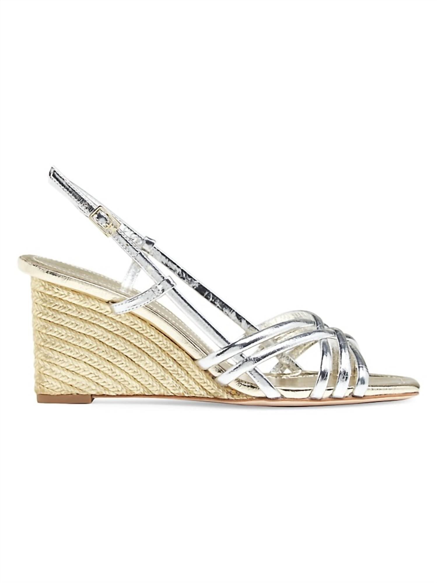 Classicly cute and all-day-wearable. We love this sandal. Introducing the Multi Strap Wedge Sandal by TORY BURCH, a stylish choice for any occasion with its stunning metallic leather finish in silver and gold. These sandals feature an open toe design and a sophisticated wedge heel measuring 3 inches (75mm), providing just the right amount of lift. Expertly crafted with a leather upper and sole, they are secured with a convenient buckle closure. Ideal for adding a touch of glamour to your ensemble, these sandals are a must-have for the fashion-conscious woman.