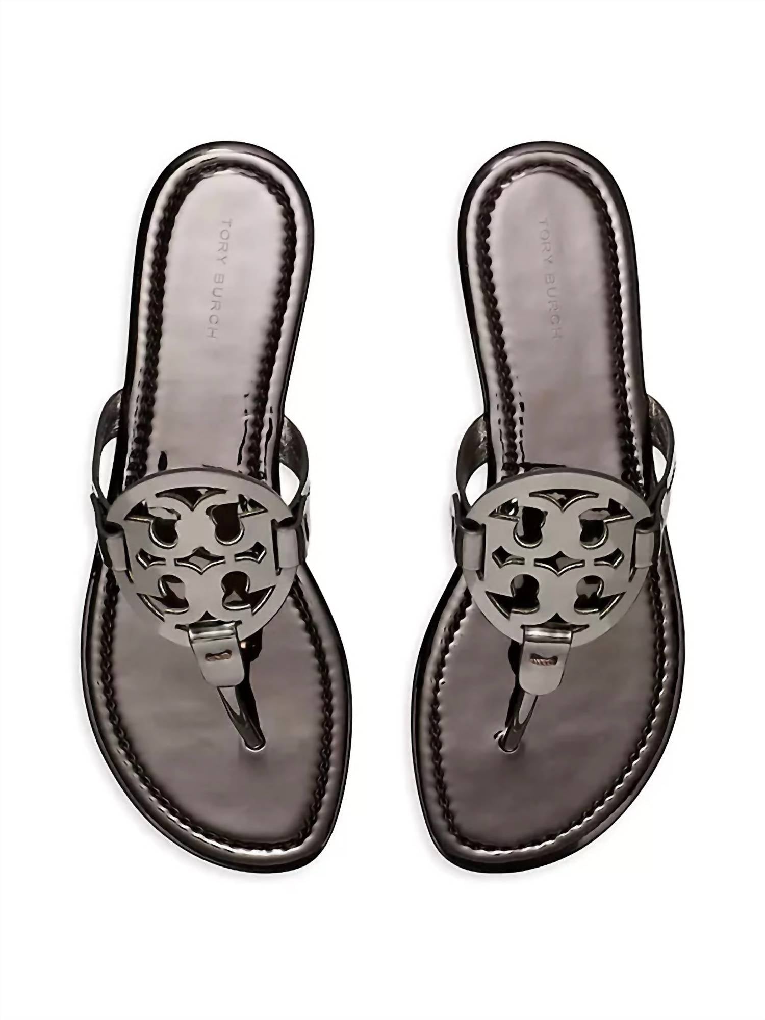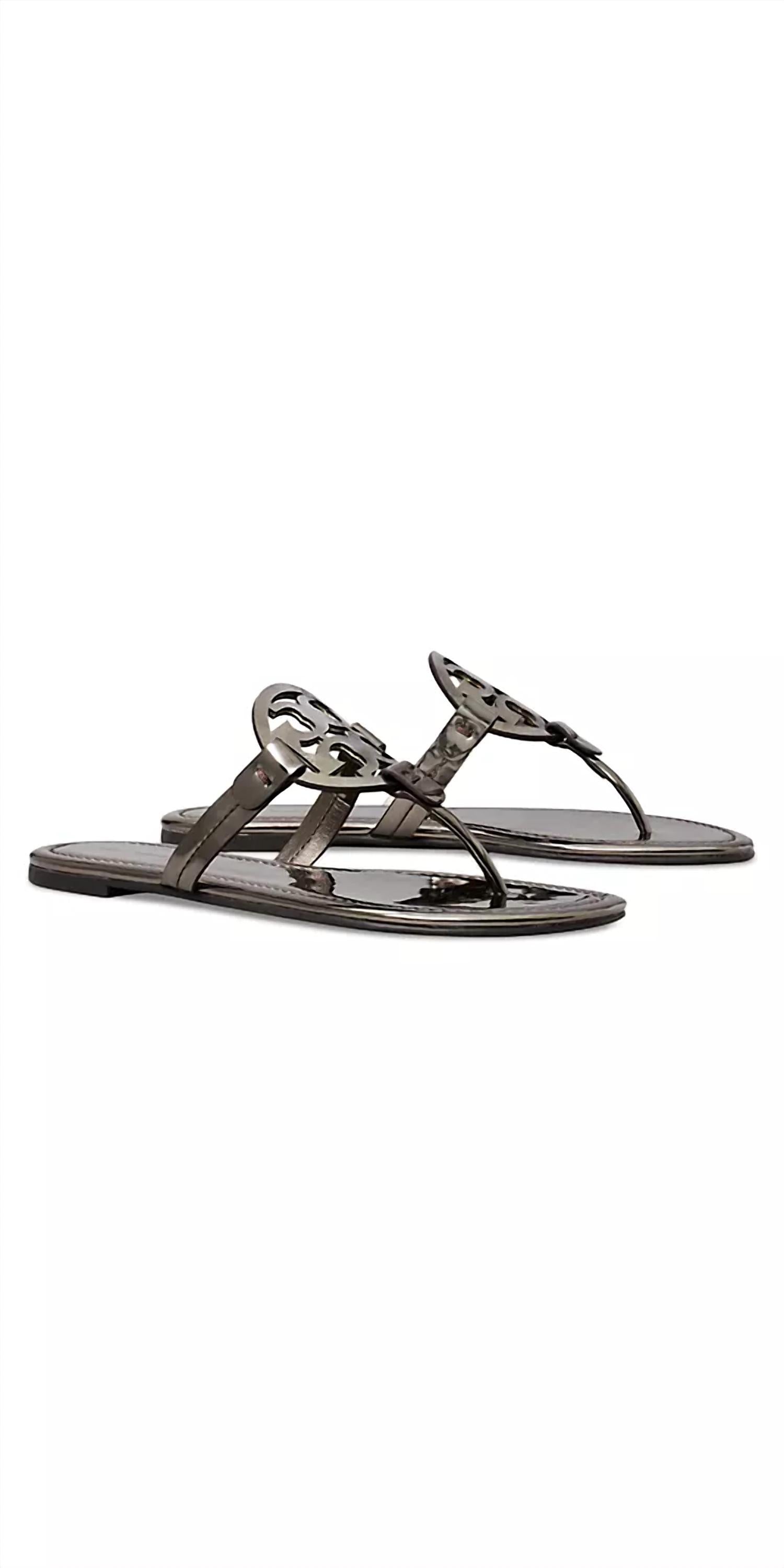 Classicly cute and all-day-wearable. We love this sandal. Tory Burch's Miller flat sandals, made from faux leather, feature the brand's iconic logo prominently displayed at the vamp, with an open-toe design and slip-on style for easy wear. The upper, lining, and sole are constructed from textile and synthetic materials, ensuring durability and comfort. These imported sandals combine style and practicality, making them a versatile addition to any wardrobe.