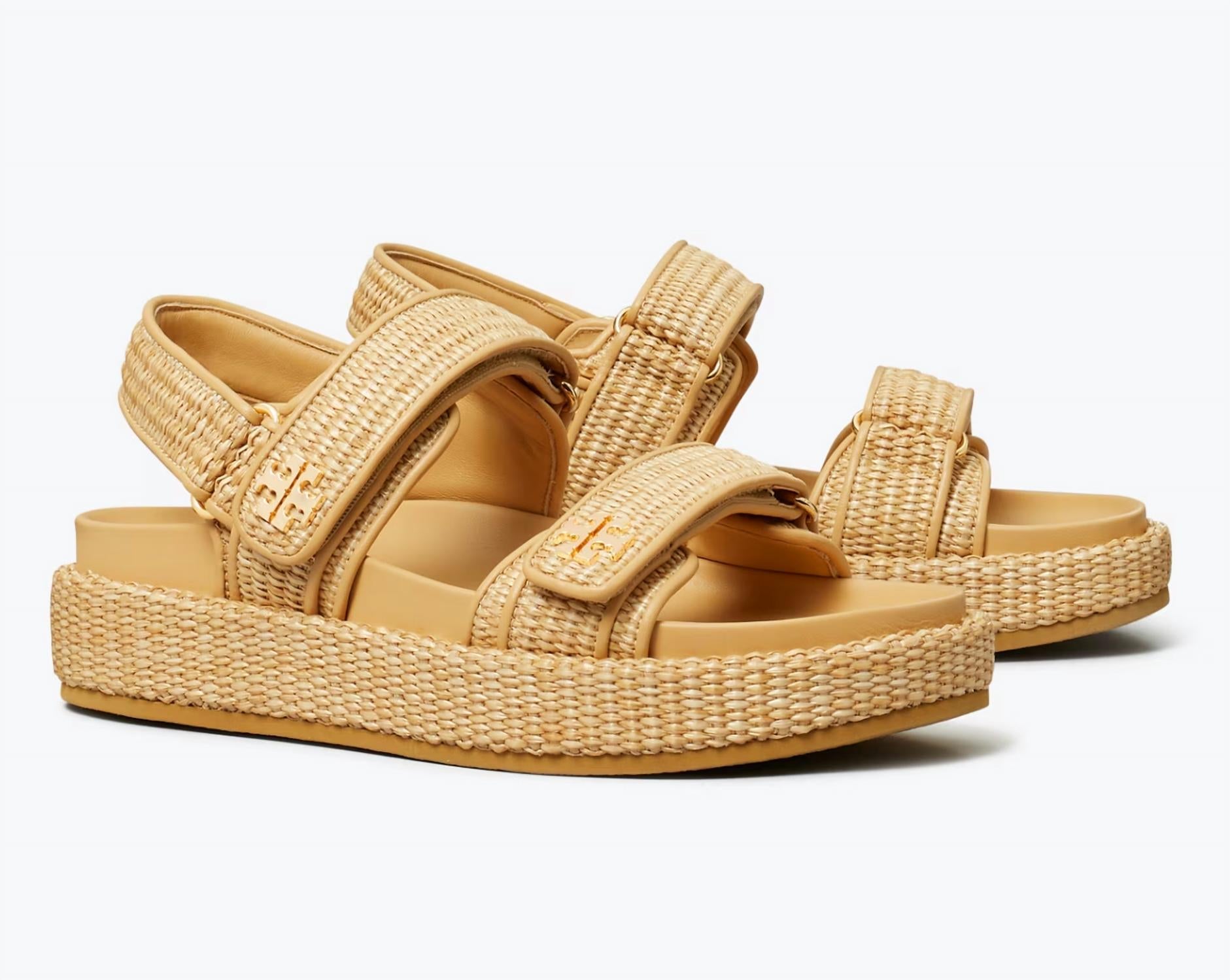 Classicly cute and all-day-wearable. We love this sandal. Step into style with the Tory Burch Women's Kira Sport Sandal in Natural Raffia, perfect for summer vacations. These flat sandals feature a 75% nylon, 25% viscose raffia upper with napa leather trim and molded leather footbed for comfort. The Velcro strap closure ensures a secure fit, while the rubber sole adds durability. To maintain their pristine look, avoid moisture, clean with a dry cloth, and store them in the included dust bag.