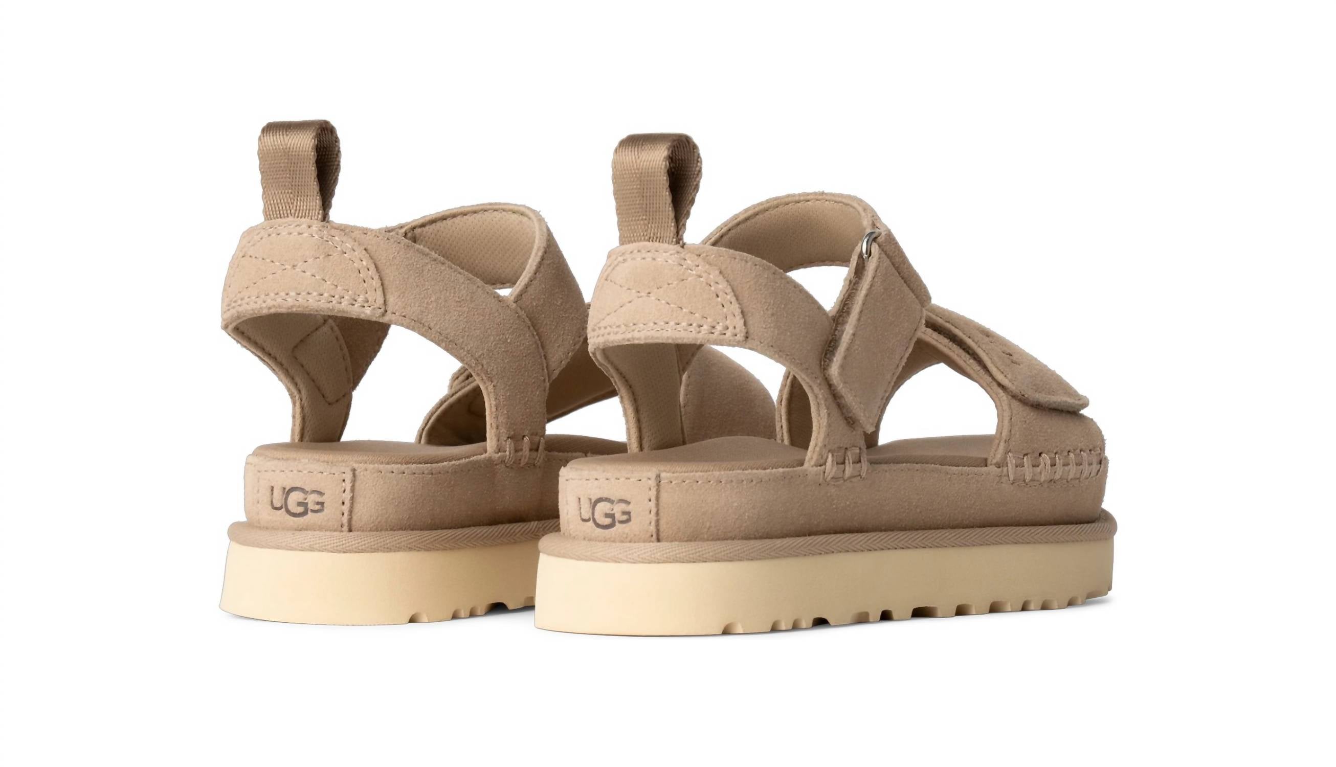 Flowy dresses, cropped pants, and even jumpsuits... this sandal works with them all! Experience the Women's Goldenstar Sandal by UGG, a perfect summer staple in a chic sand hue. Crafted with a velvety suede upper and lined with recycled polyester fibers, this sandal boasts a round toe and a flat heel style for versatile wear. Featuring adjustable ankle and vamp straps with hook-and-loop closures, it offers a customized fit, complemented by a contoured EVA footbed and a sugarcane EVA midsole and outsole, ensuring comfort and sustainability. Proudly made in a factory supporting women's empowerment, this sandal embodies both style and substance. Ideal for travel, it channels '90s fashion vibes, making it perfect for summer occasions like the 4th of July.