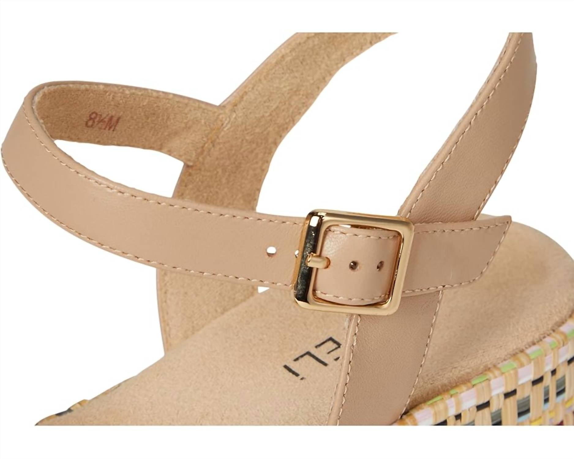 Dresses, denim, shorts... these wedges go with just about anything. Add playfulness to your style in the Vaneli® Walda wedge sandal. Adjustable ankle strap with buckle closure. Raffia and leather upper. Leather lining. Rubber outsole. Heel Height: 2 in