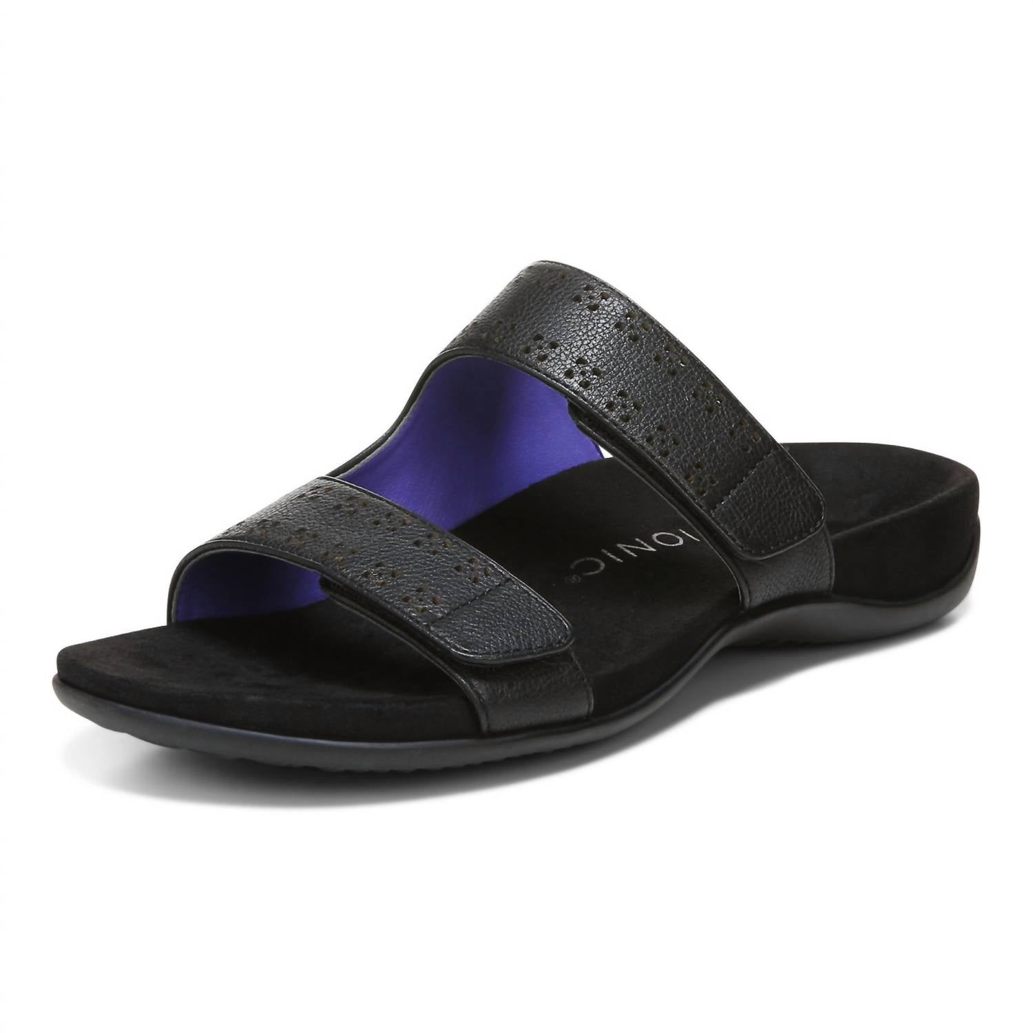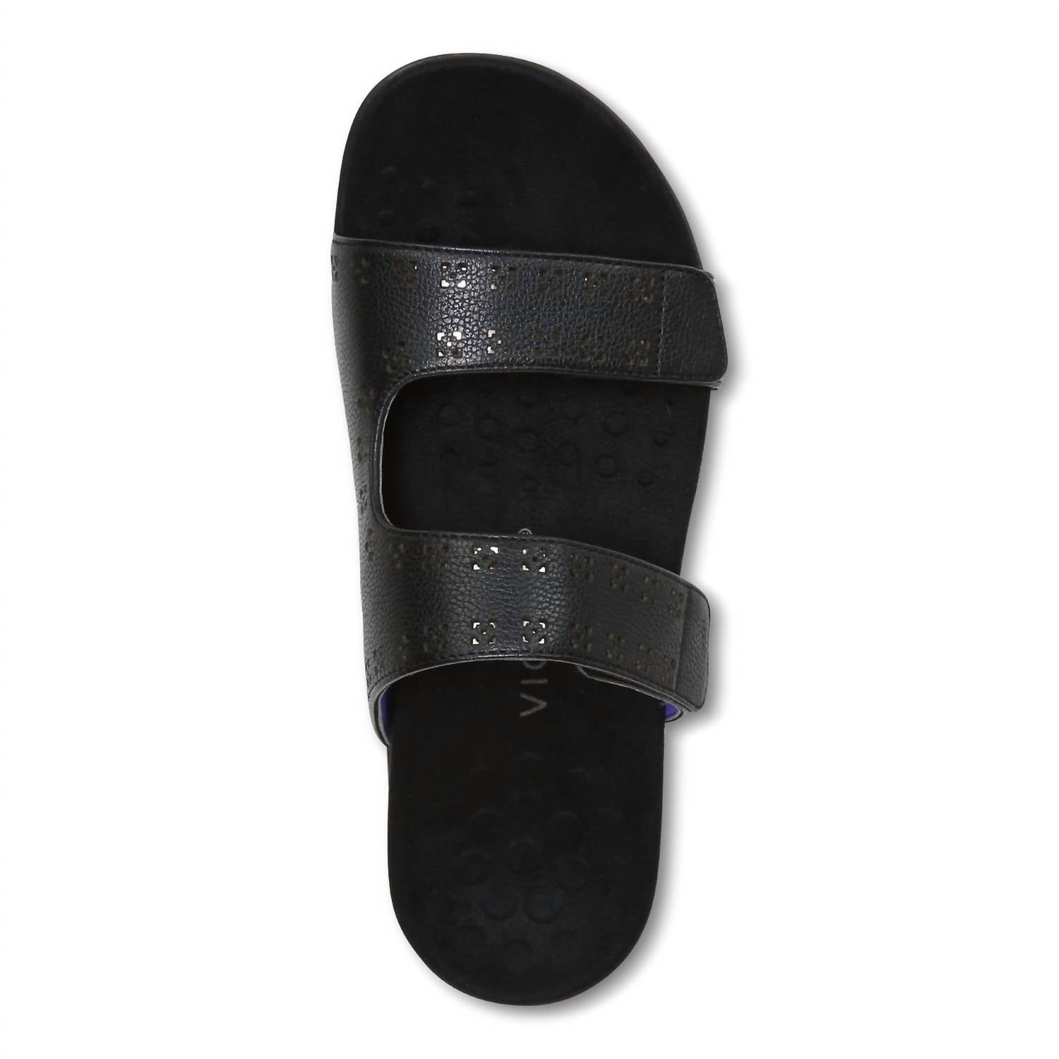The Vionic Nakia Women's Adjustable Slide Orthotic Sandals. These sandals feature two adjustable straps made from leather metallic and synthetic materials for a tailored fit. The podiatrist-designed footbed offers THREE-ZONE COMFORT, addressing plantar fasciitis and other foot concerns. Lightweight and flexible, the EVA midsole and durable rubber outsole reduce stress on your feet, ankles, and knees while providing excellent traction.