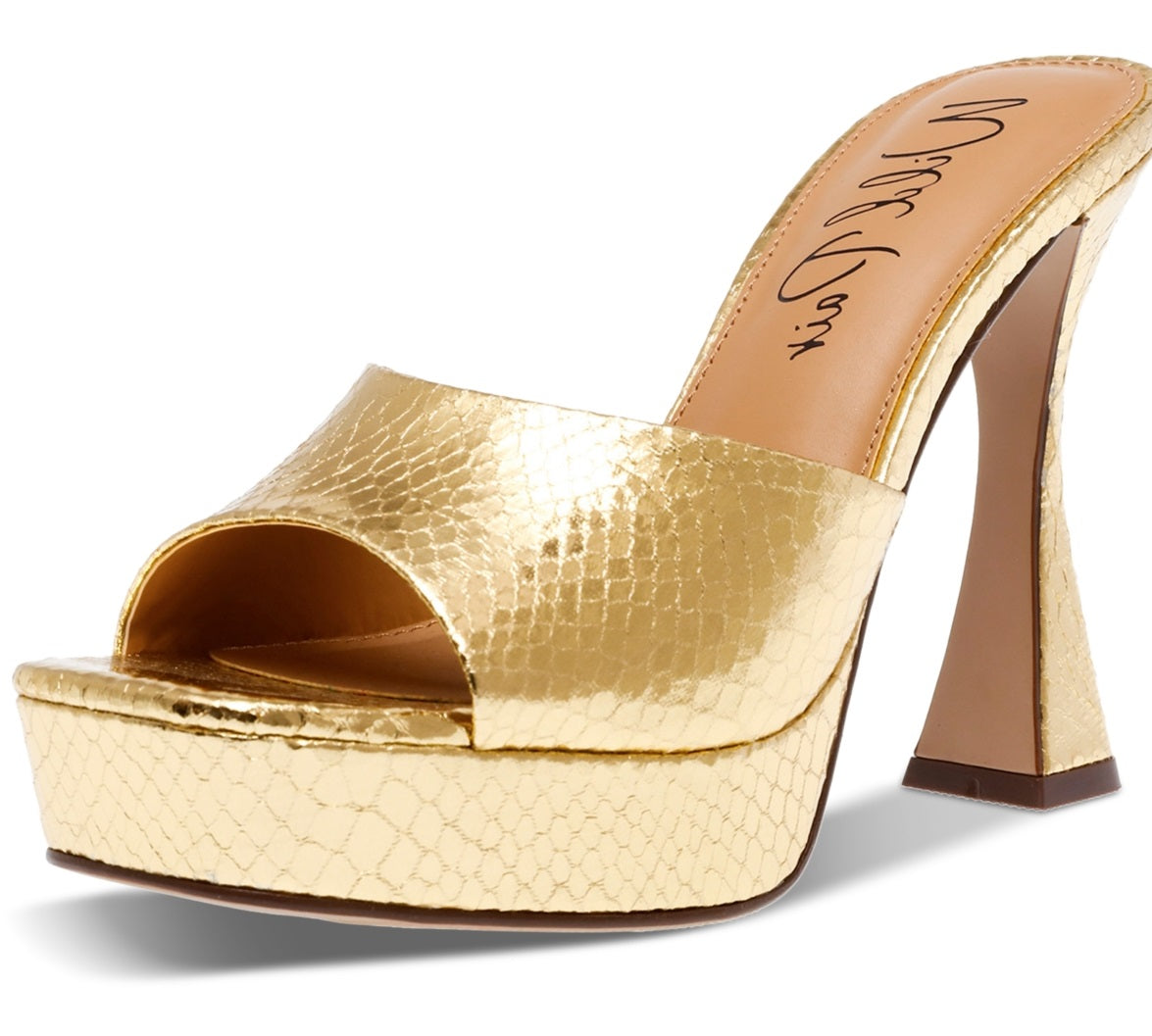 Exciting style is underfoot with the sleek platforms| chic flared heels and cushiony design of the Rajaah slides from Wild Pair.| 4-5/8 flared heel; 1 platform| Square-toe slip-on slide sandals| Runs true to size; order your normal size| Memory foam for comfort; breathable lining; slip-resistant sole|