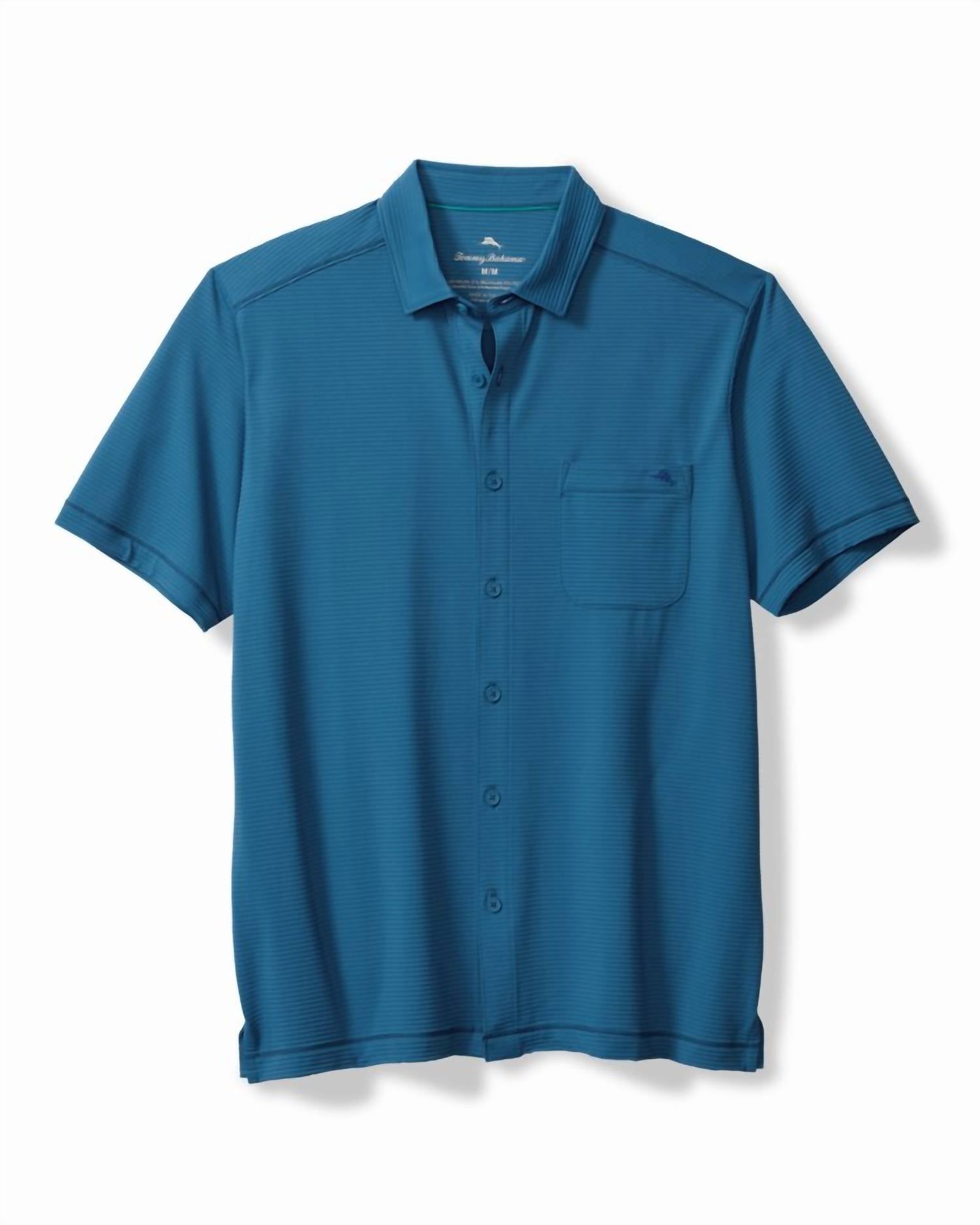 This short sleeve piece in a captivating Deep Azure features a hint of stretch and a chic seersucker texture with subtle stripes. Proudly showcasing an embroidered Marlin logo on the chest patch pocket, it is designed for modern men who value comfort and style. Care is straightforward with machine wash instructions ensuring easy maintenance. 60% recycled nylon, 31% recycled polyester, 9% spandex.