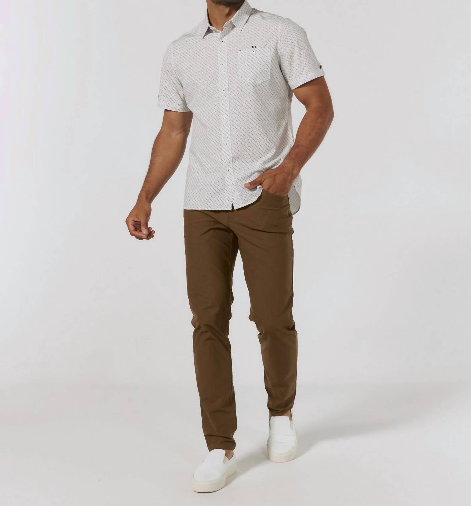 Discover the Arcos Short Sleeve Shirt by 7Diamonds, a perfect blend of comfort and style for your wardrobe. This women's short sleeve, patterned shirt is made of 94% Polyester and 6% Spandex, offering excellent 4-way stretch, moisture wicking, and wrinkle resistance. It features a classic button closure and a traditional collar, ideal for summer dinner parties. Care: Machine wash cold on delicate cycle with similar colors and hang to dry, ironing on low if necessary. Model is 6'1" and wears a size medium.