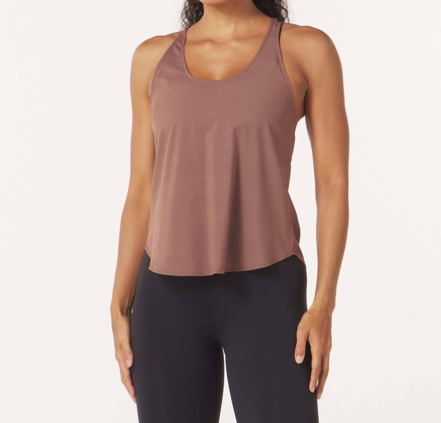 Introducing the Pyramid Tank by Glyder, a stunning piece in a solid chestnut hue, perfect for enhancing your summer athleisure wardrobe. Designed for ultimate freedom with its sleeveless cut, this tank offers a scoopneck and a low back for added ventilation, making it ideal for fitness and workout sessions. The light and airy stretch woven fabric is combined with v-strap details and a subtle curved hem, providing a flattering fit without restriction. Closure type: Pull On.