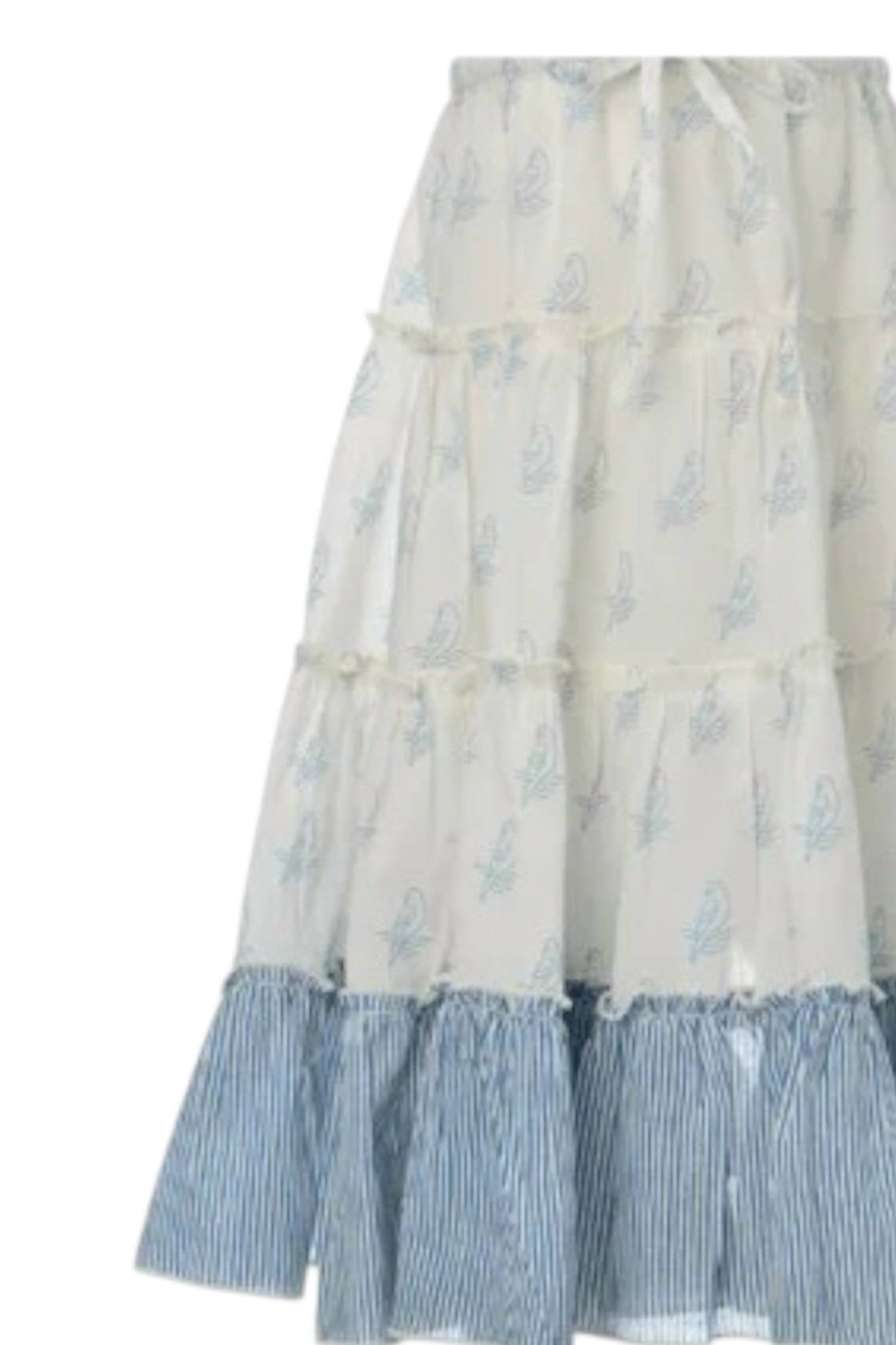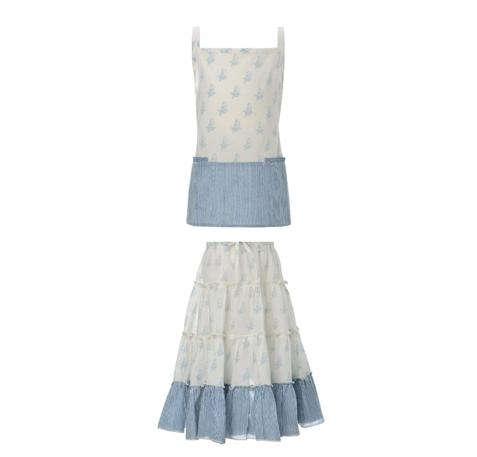 Embrace playful style with the Kid's Mia Parrot Set by Guadalupe Design, featuring a charming blue parrot print. The set includes a cotton camisole top with a delightful bow closure and a tiered, pleated cotton skirt with a lining, ensuring comfort and flair. Care for this vibrant ensemble by machine washing cold, tumble drying low, and applying a steam iron. Enjoy a splash of whimsy in your child's wardrobe today.