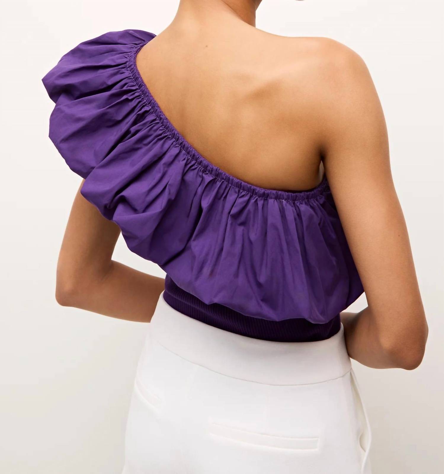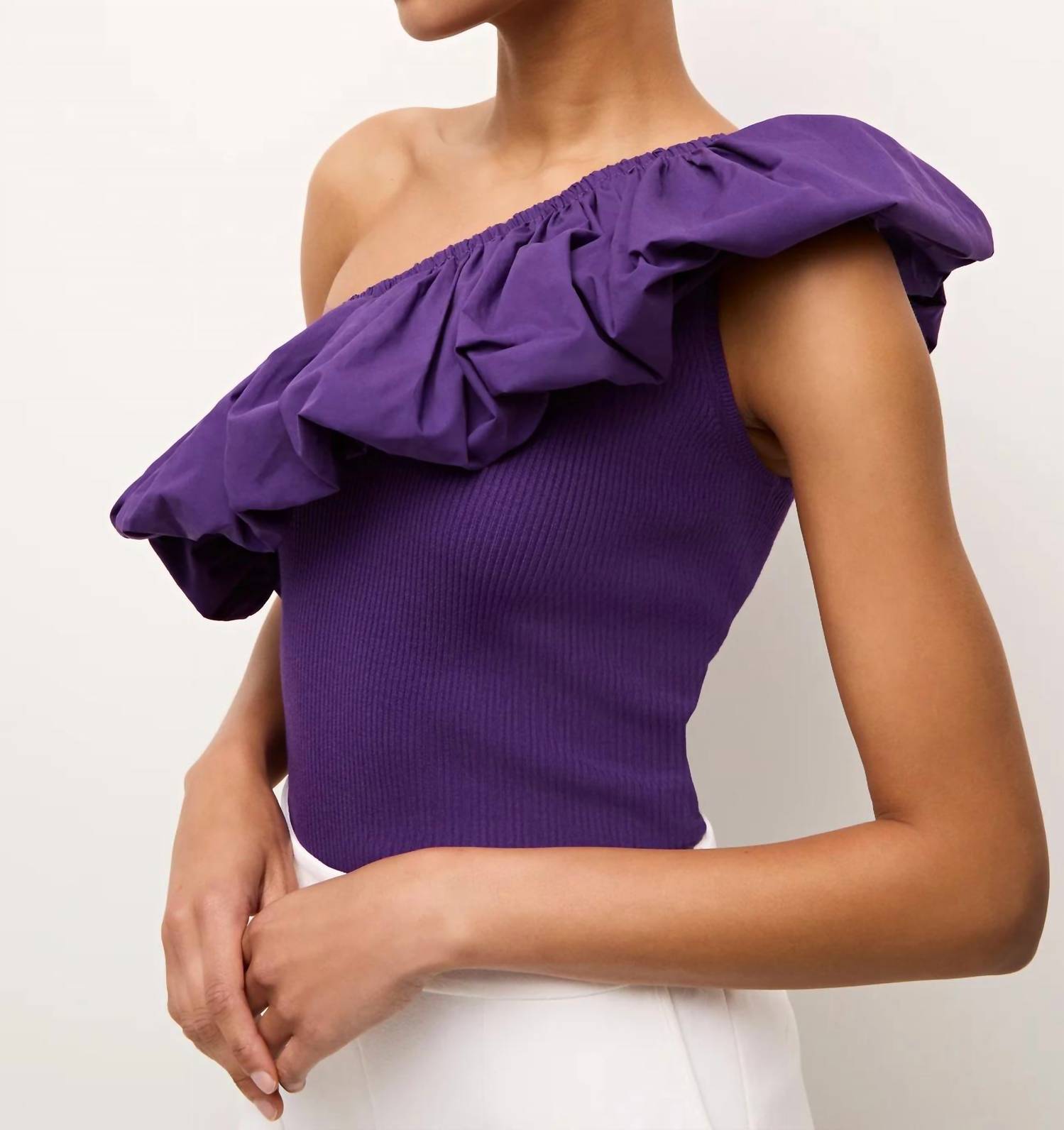 Oversized one-shoulder ruffle neckline. Ribbed, body-con bodice. Unlined. 82% viscose, 18% polyester. Hand wash cold separately with mild detergent, lay flat to dry, low iron or dry clean.