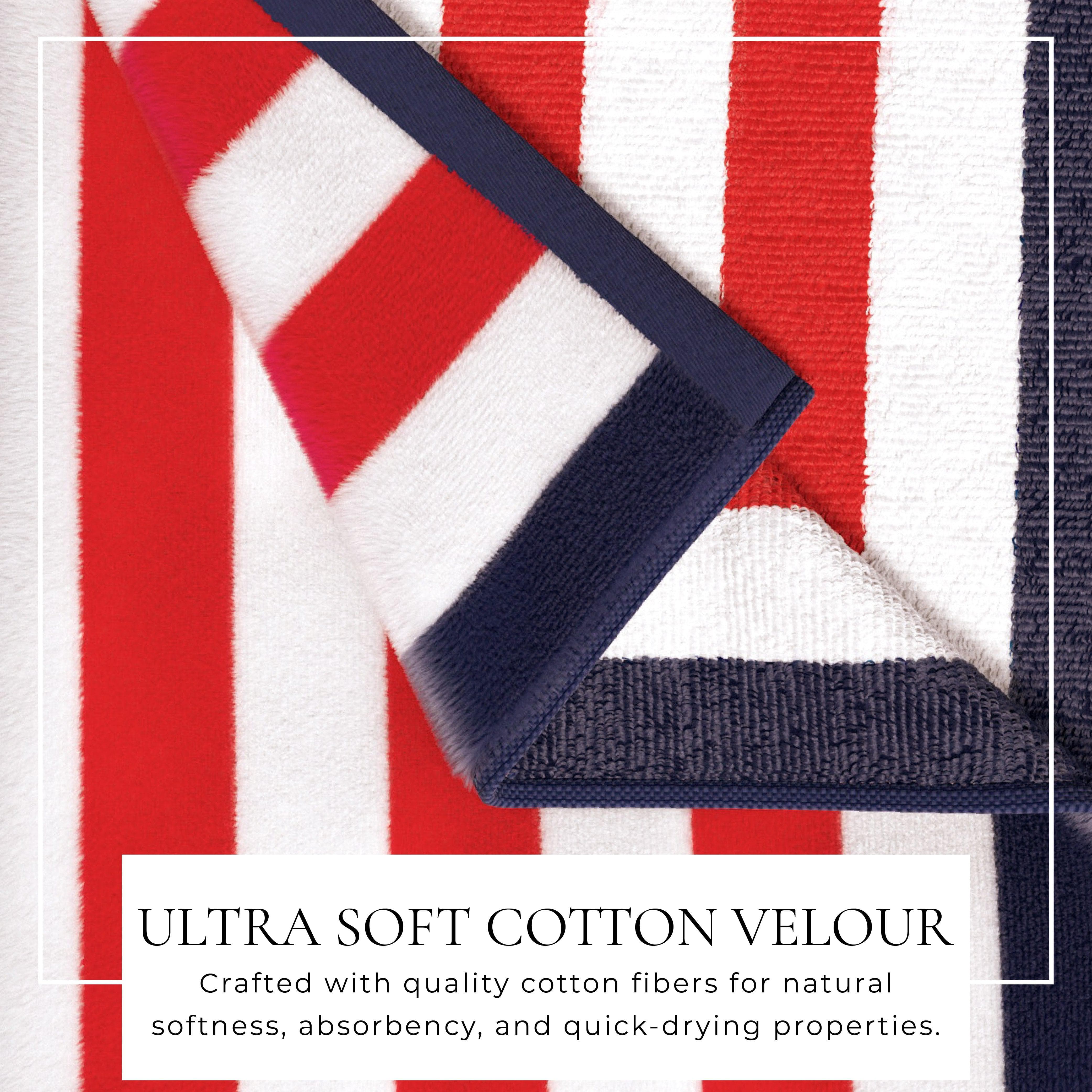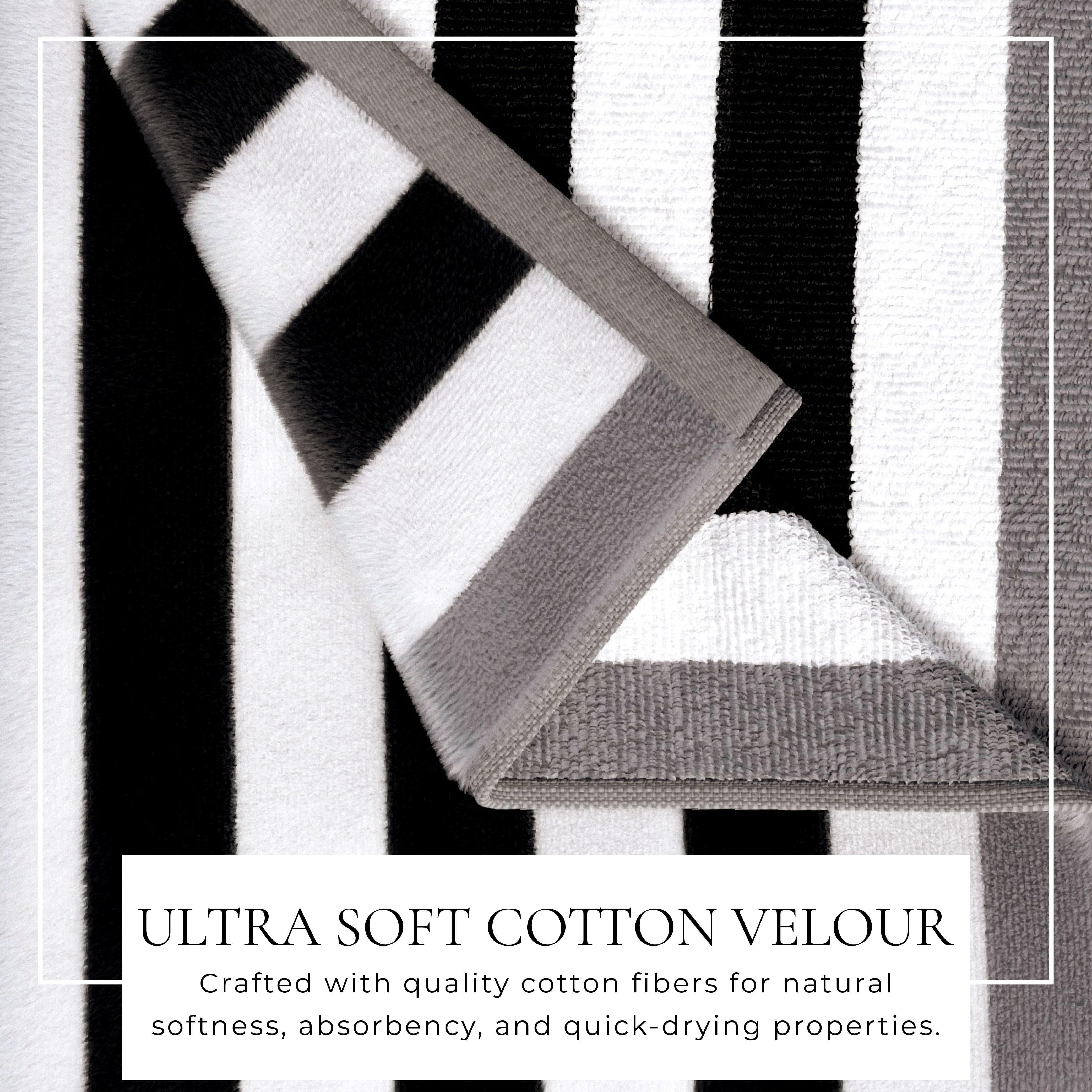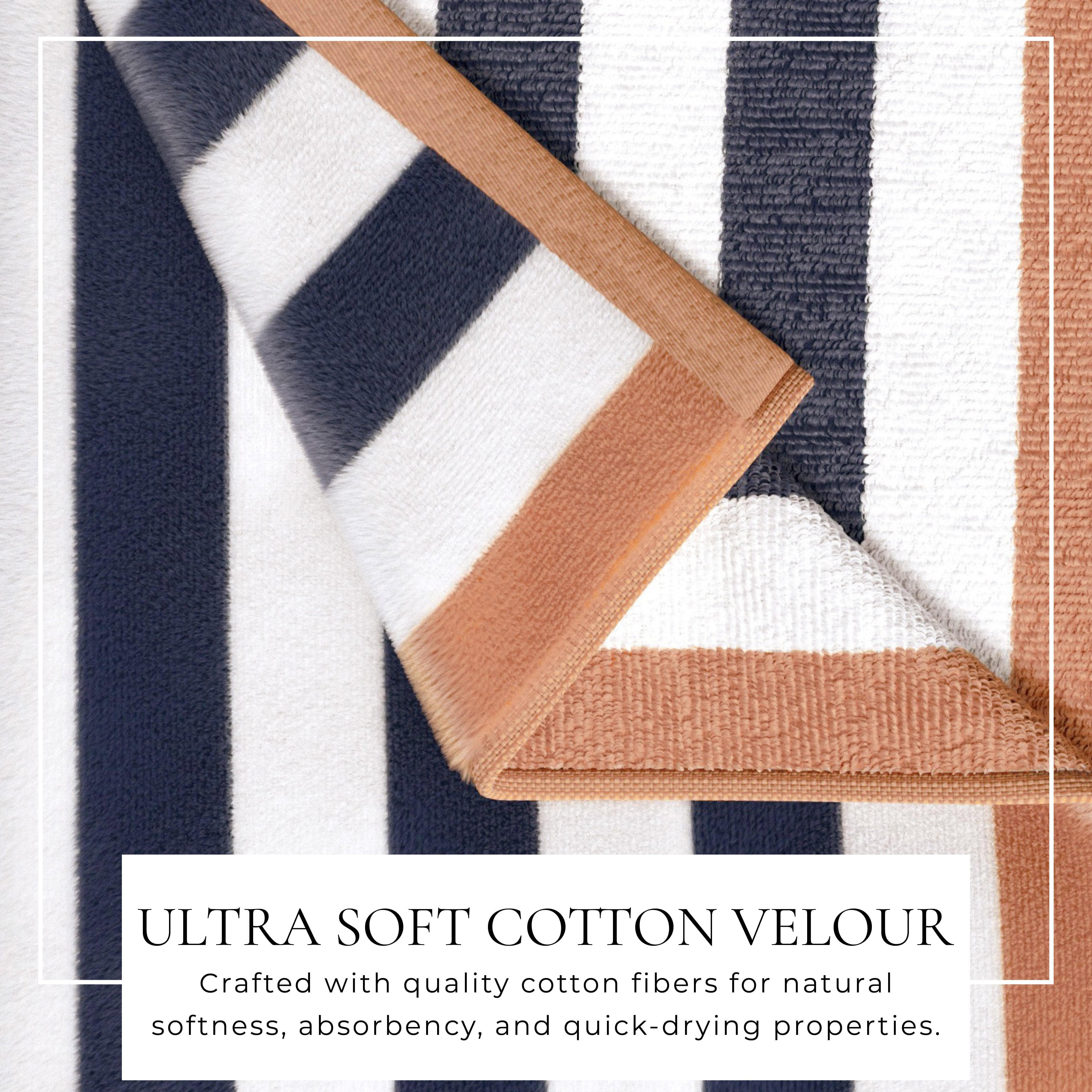 Elevate your beach experience with our oversized, ultra-soft cotton striped beach towels. Made from 100% cotton velour, this towel features an elevated, thin-striped design for a sophisticated twist on a classic. Perfect for relaxing on the sand, lounging by the pool, or accompanying you on summer adventures, this towel combines timeless style with exceptional durability. Crafted to withstand many seasons of fun, its plush and absorbent texture will keep you comfortable wherever your journey takes you. Easy to care for, simply machine wash with like colors and tumble dry low for a softer, more luxurious feel after every use. -