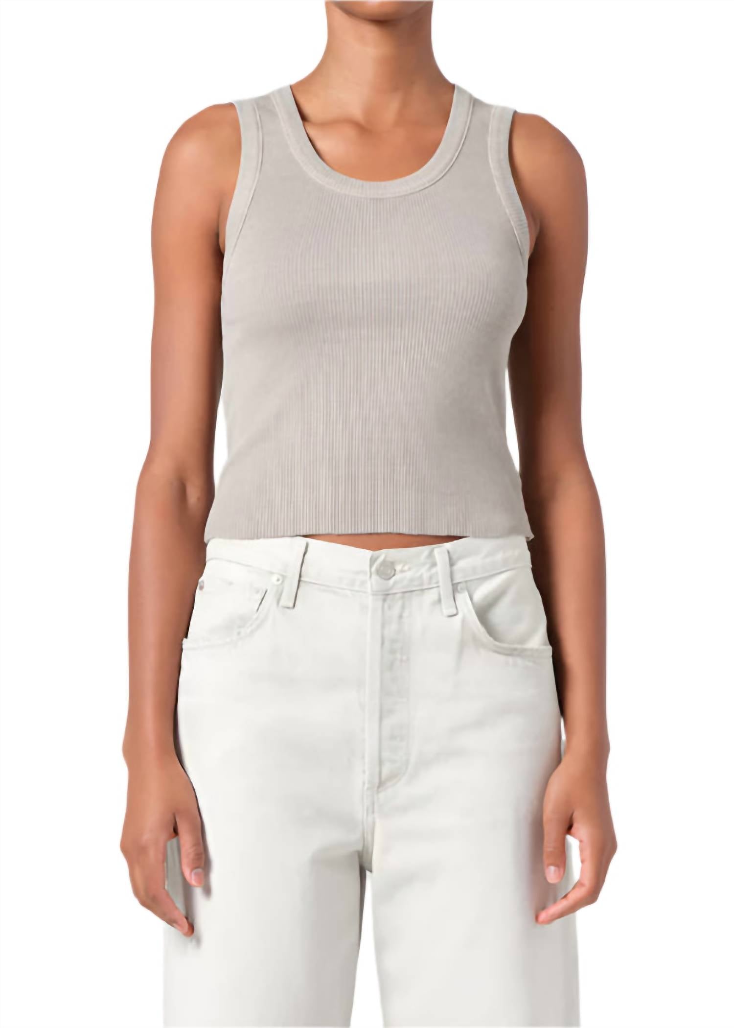 This classic tank top is perfect for layering and cute enough to wear on its own. Introducing the Shrunken Poppy Tank Top by AGOLDE, a stylish blend of comfort and elegance perfect for any occasion. This sleeveless tank, crafted from a cotton blend of 49% Organic Cotton, 49% Lyocell, and 2% Spandex, offers a breathable feel with a flattering U-shape neckline that hugs the body. Made in the USA, this pull-on tank in drab is ideal for layering or wearing alone. Care instructions: Hand wash and line dry for best results.