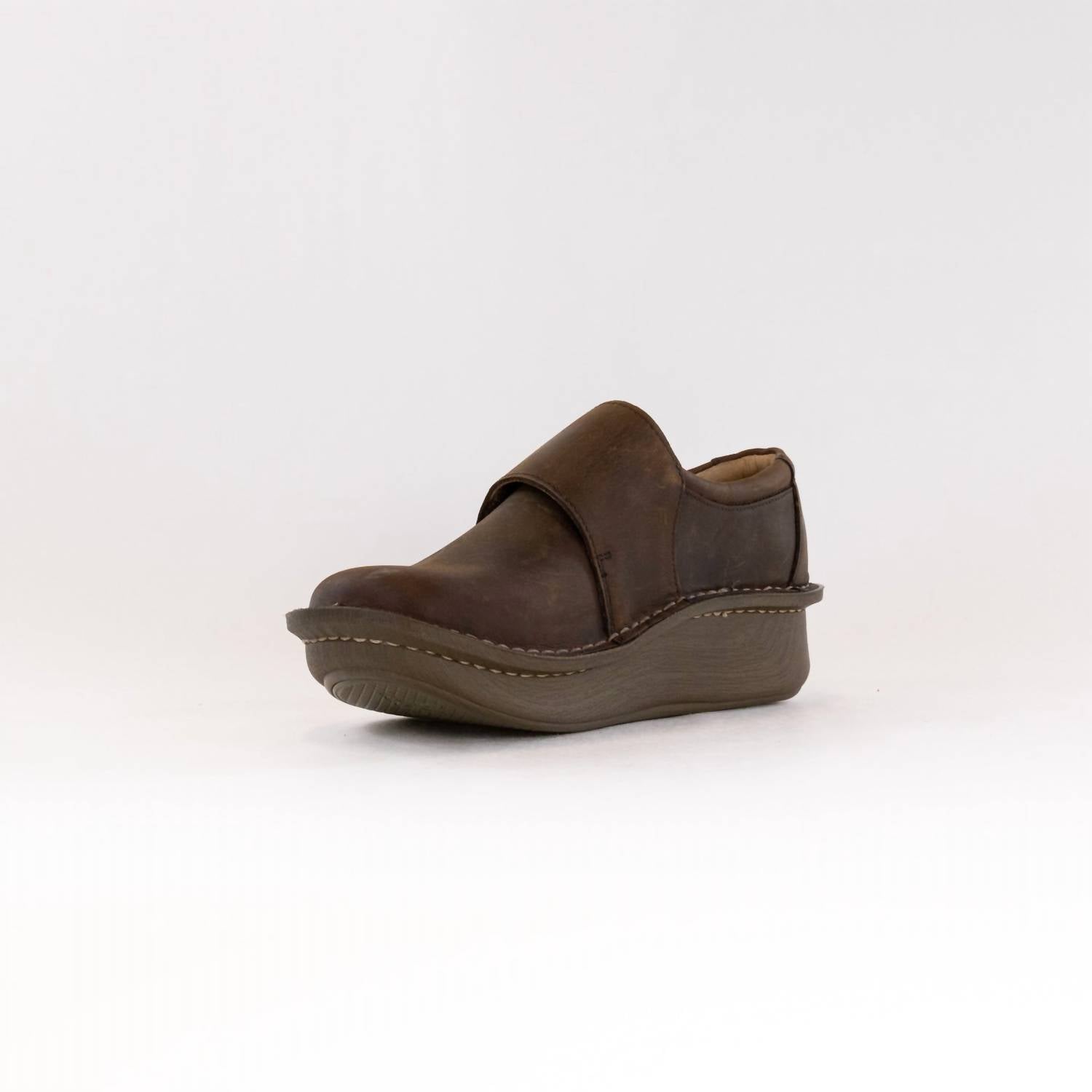 Dresses, denim, shorts... these wedges go with just about anything. Introducing the Alegria Women's Deliah Loafers in a rich Oiled Brown, expertly crafted for comfort and style. These shoes boast an adjustable hook-and-loop closure adorned with decorative artisanal hardware for a custom fit. Made with a leather upper and a suede leather footbed, they ensure durability, especially with their slip-resistant classic rocker outsole. Enjoy enhanced foot support from the ergonomically designed removable footbed, cushioned with memory foam and cork, and a low wedge heel height of 1.75 inches, perfect for all-day wear.
