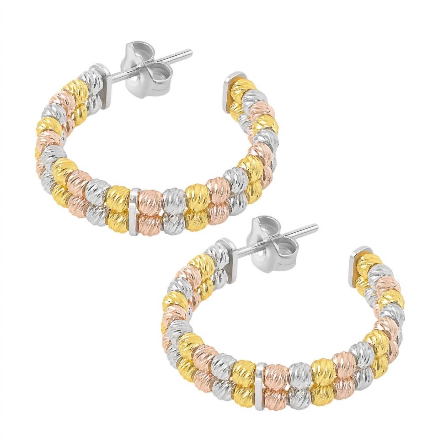 The Women's Round Diamond Cut Bead Double Row Post Hoop Earrings by Allyanna Gifts offer a sophisticated tri-tone design. Crafted from fine sterling silver, these earrings feature a push back clasp for secure wear. The dimensions include a 5mm thickness, 24mm width, and 24.5mm height, perfect for an elegant and polished look. Add a touch of refinement to your accessories collection with these beautifully designed earrings.