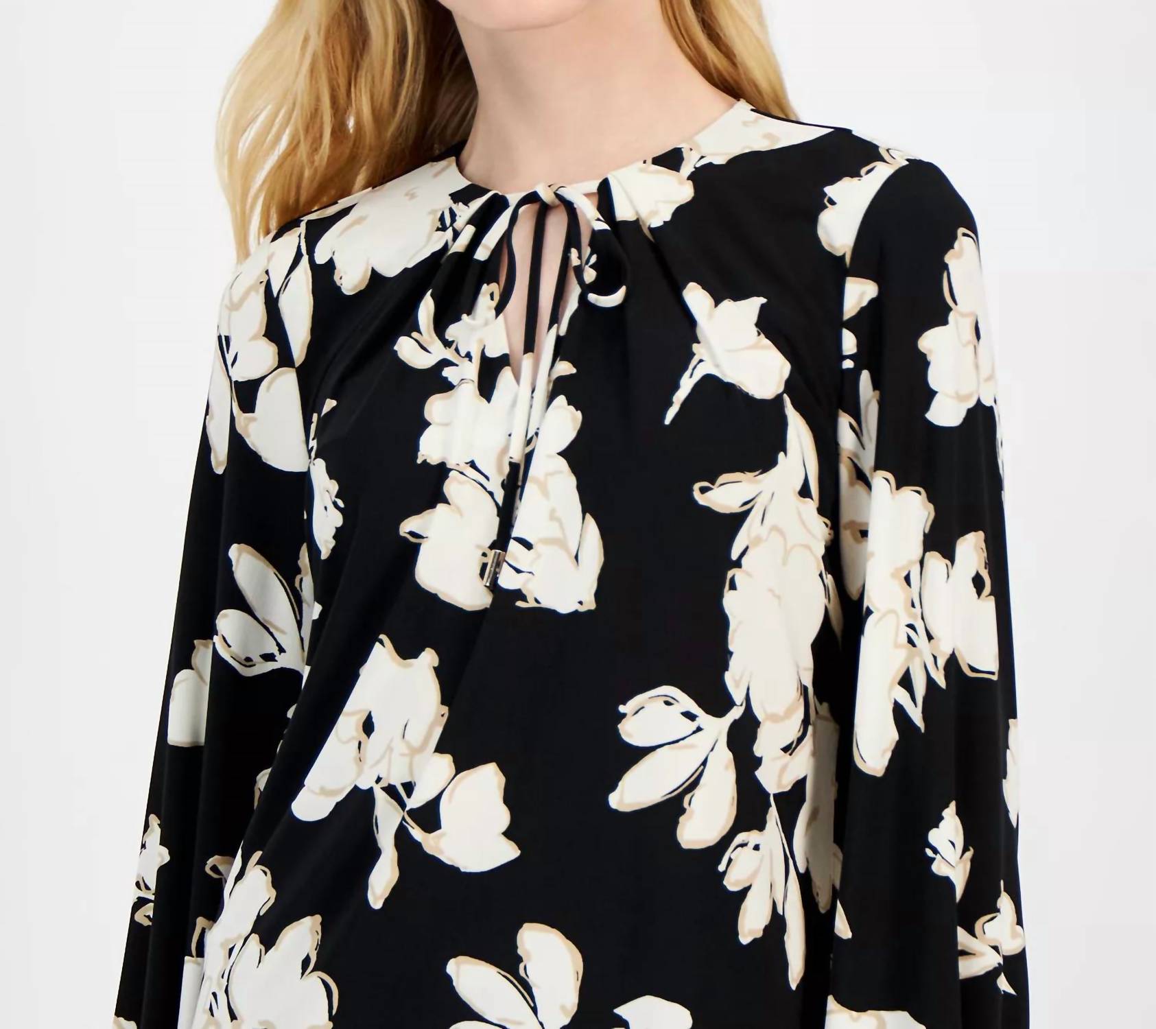 Elevate your vacation wardrobe with the Tie-front Split-neck Blouse by ANNE KLEIN, a floral delight in Black Multi perfect for the boho chic trend. This women's blouse features long sleeves and a flattering V-neckline, offering both elegance and versatility. Made from polyester, it showcases a tie closure for easy styling. Care instructions: Hand wash only.