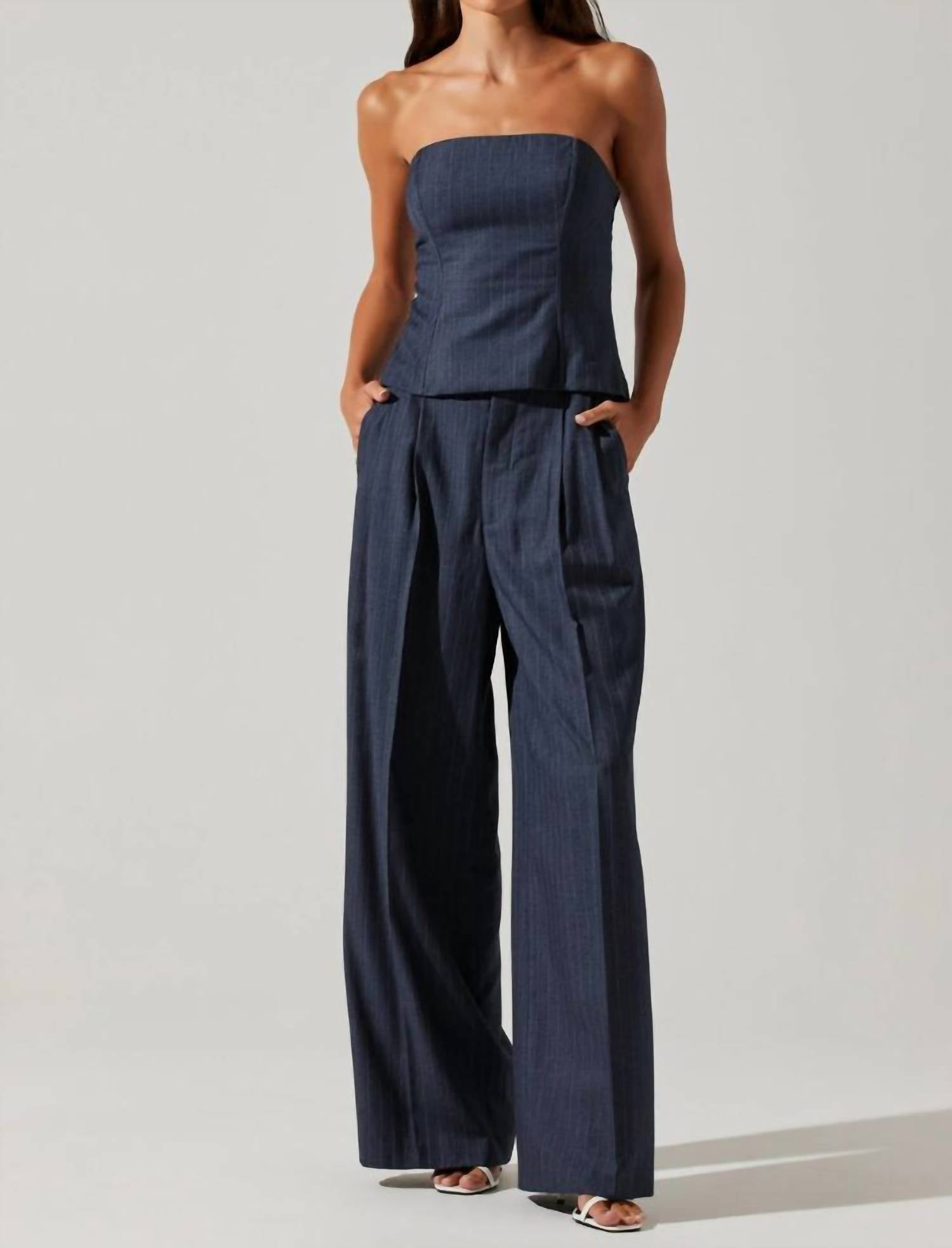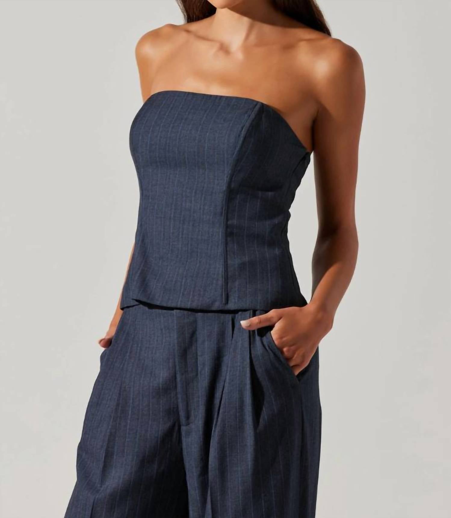 Introducing the Kalani Pinstripe Tube Top by ASTR, a chic strapless piece that effortlessly elevates your wardrobe. This navy blue chalk stripe top, featuring a darted bodice, offers a supportive fit with its corset-style back and side zipper closure. Crafted from 70% Polyester and 30% Rayon. For optimal care, dry clean this elegant off-the-shoulder style, perfect for both day and night occasions.
