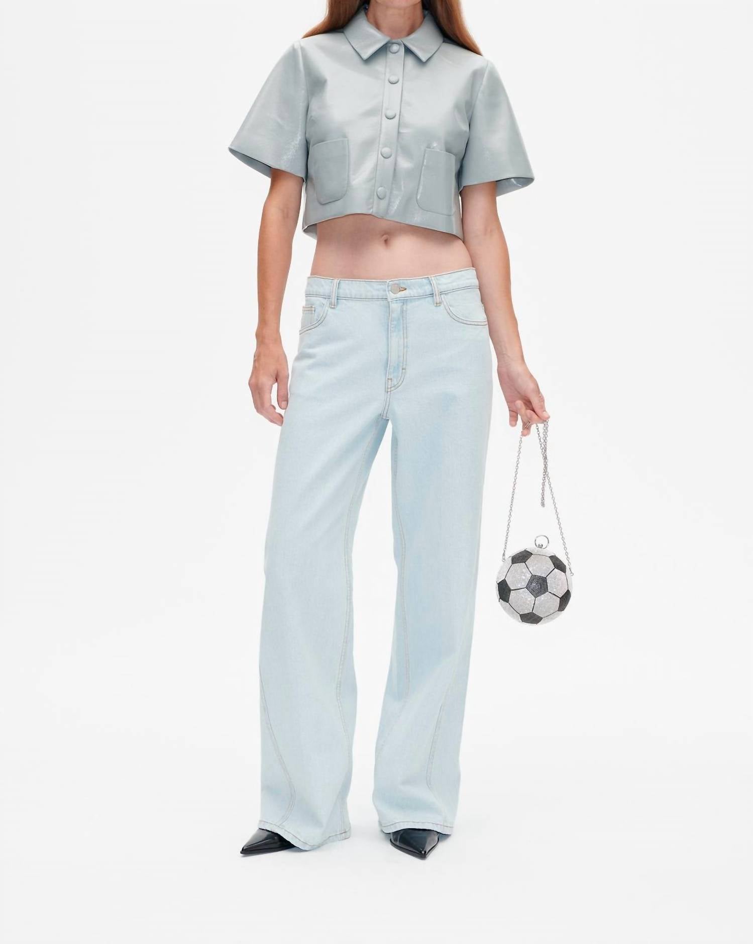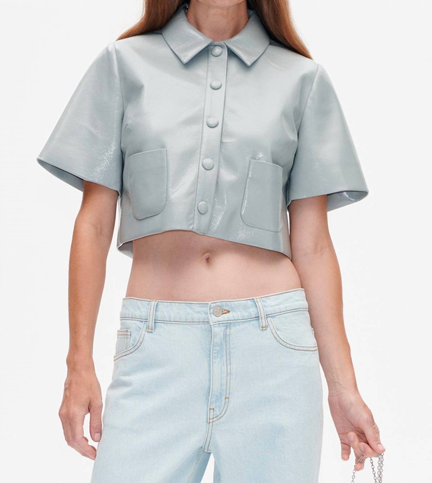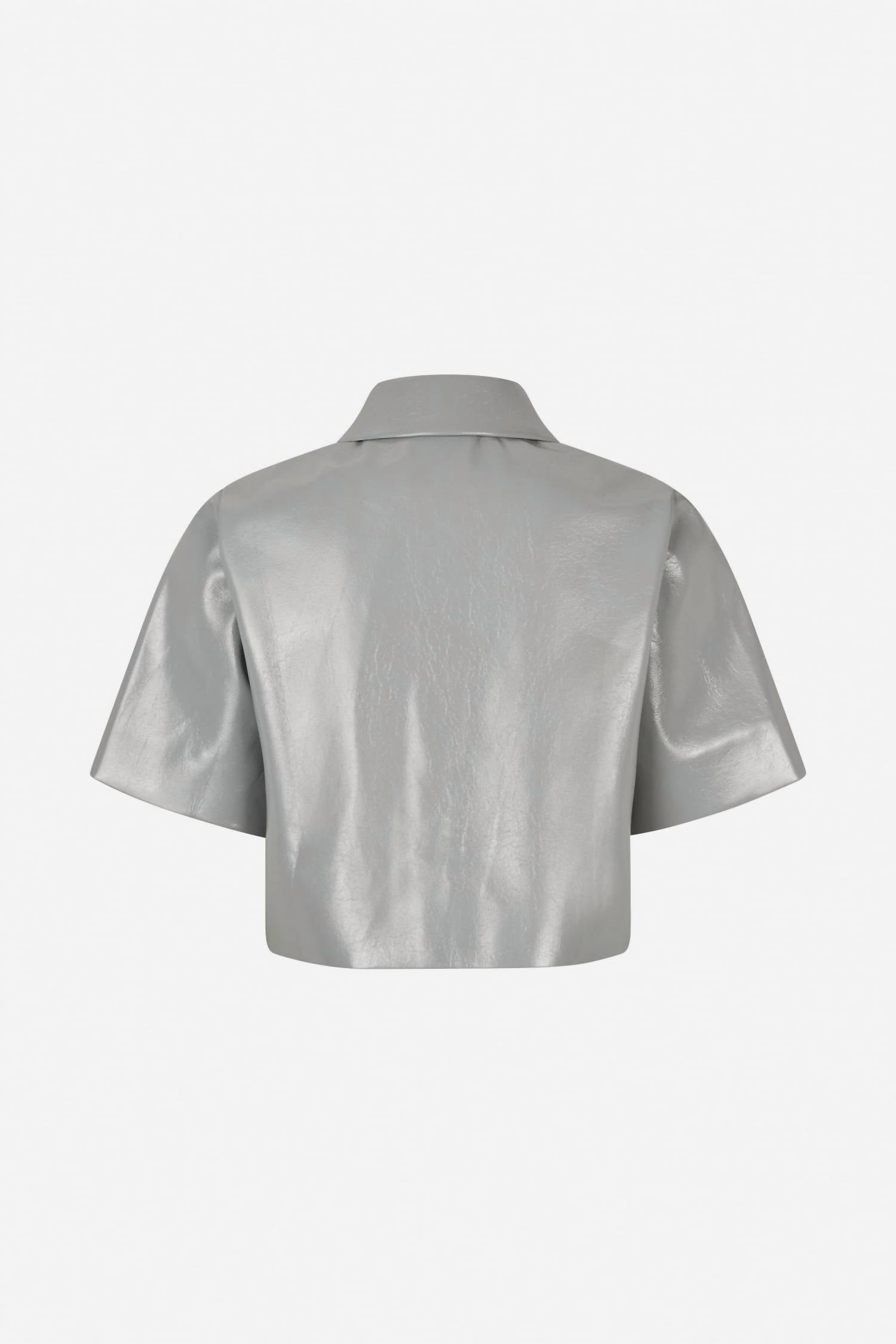 Elevate your style with the Beth Jacket by BAUM UND PFERDGARTEN in a chic Griffin Grey. This cropped, patent-style piece features short sleeves and a classic collar with a modern edge, perfect for the minimalist trend. Constructed from 50% recycled polyester and 50% polyurethane, with a lining of 52% polyester and 48% viscose, it offers both style and sustainability. Practical snap button closures and two patch pockets ensure functionality. Care instruction: Do not wash.