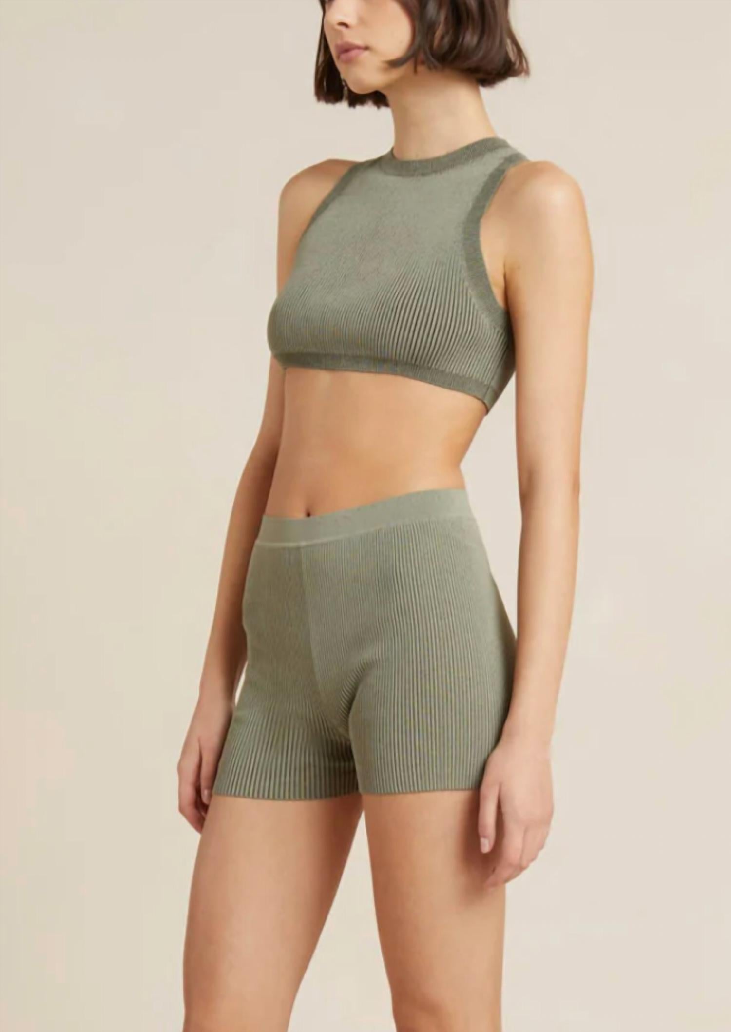 The perfect crop top for those warmer weather days. Elevate your activewear collection with the Tilly Knit Crop Top by BEC + BRIDGE in a refreshing sage hue. This sleeveless top features a flattering mockneck and racer back, designed for a fitted cropped silhouette perfect for summer fitness or workout sessions. Made from ribbed knit fabric, it offers a stretch fit that is both bra-friendly and versatile. The solid pattern and pull-on closure make it an effortless addition to any wardrobe.