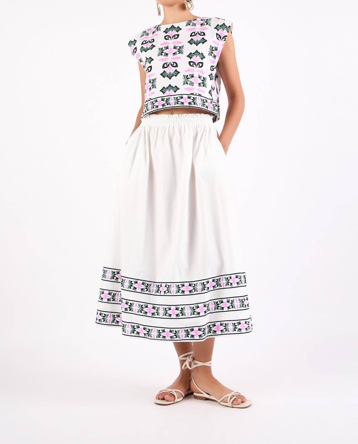 Discover the Amber Skirt by BEYOND by Vera, a fashionable choice in the captivating Papillon Moss pattern. This midi skirt showcases a flattering A-line silhouette with hidden pockets and a comfortable elastic waistband, making it perfect for casual or dressy occasions. Crafted from 100% breathable Cotton Poplin, it features a geometric pattern inspired by butterflies of the Pyrenees. Care: Gentle cycle machine wash or dry clean. Made in India with a pull-on closure for easy wear.