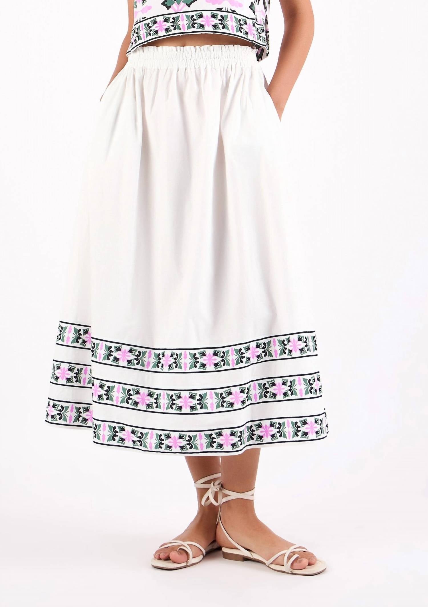 The midi length skirt is here to stay and we especially love this style. Discover the Amber Skirt by BEYOND by Vera, a fashionable choice in the captivating Papillon Moss pattern. This midi skirt showcases a flattering A-line silhouette with hidden pockets and a comfortable elastic waistband, making it perfect for casual or dressy occasions. Crafted from 100% breathable Cotton Poplin, it features a geometric pattern inspired by butterflies of the Pyrenees. Care: Gentle cycle machine wash or dry clean. Made in India with a pull-on closure for easy wear.