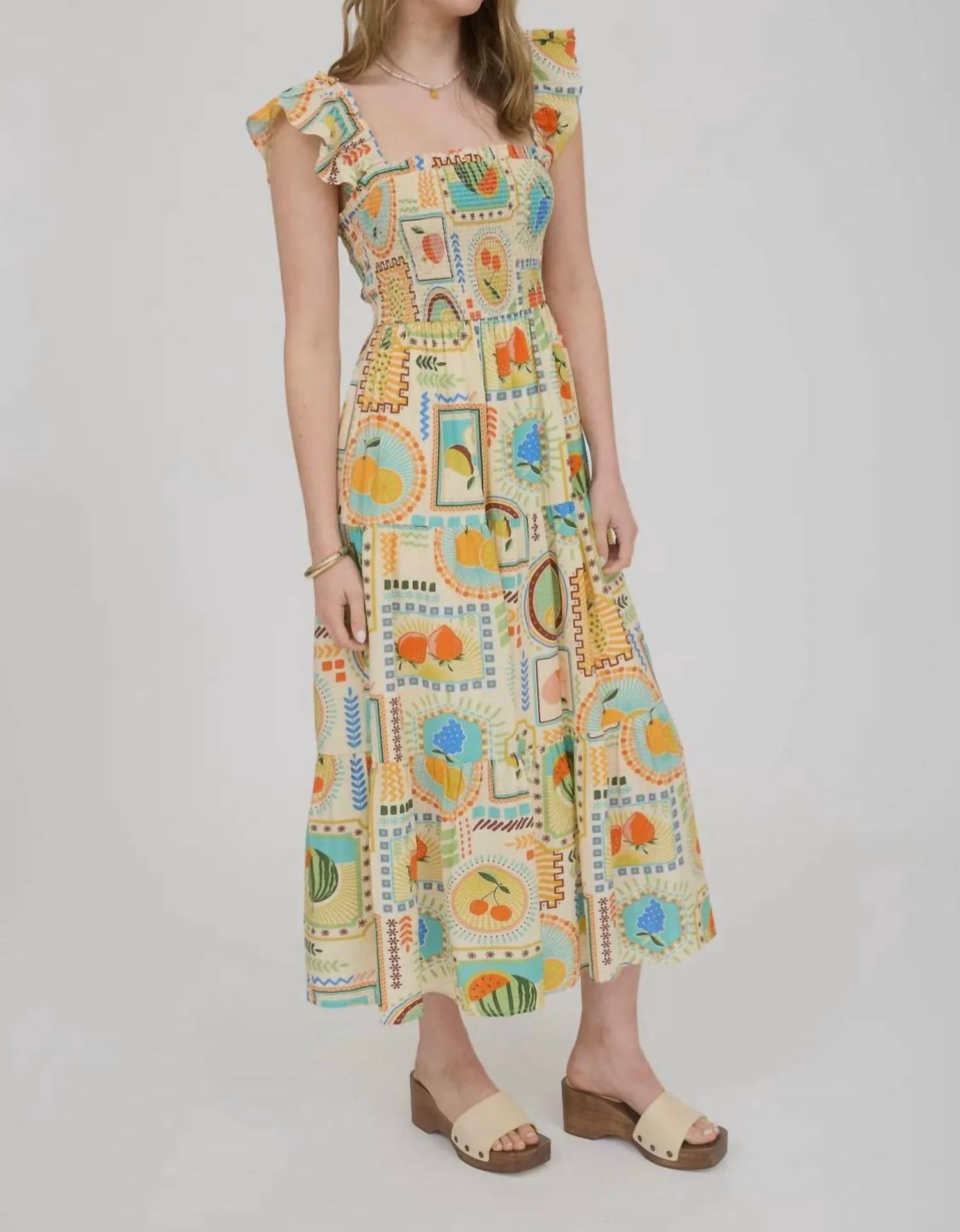Just add slides or mules and you are good to go. Elevate your summer wardrobe with the Patchwork Fruits Dress by Blu Pepper, featuring a charming multicolor fruit print that's perfect for any holiday party. This midi-length dress boasts cap ruffle sleeves, a square neckline, and a smocked bodice for a flattering fit. Crafted from 85% rayon and 15% nylon, with a 100% polyester lined skirt, it offers an effortlessly stylish A-line silhouette. Closure: Pull on. Care: Hand wash and line dry. Ideal for streetwear and Thanksgiving occasions.