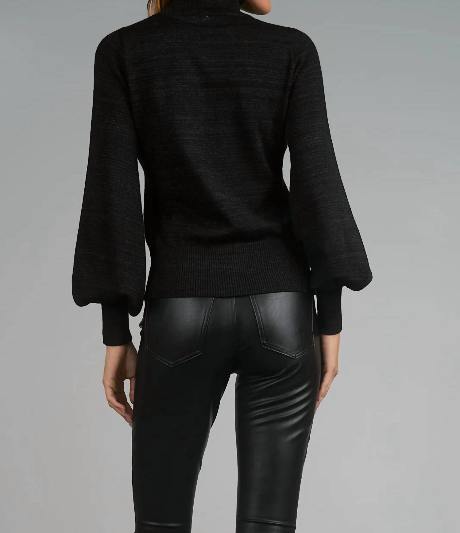 Asymmetrical Cutout Sweater. Turtleneck. Long balloon sleeves. Asymmetric cutout at front right shoulder. Striated knit, ribbed trim. Pullover style.