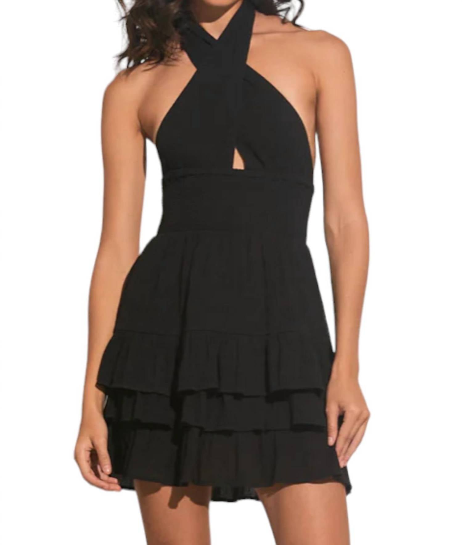 The kind of easy and flattering dress you'll be reaching for all season long. Stunning fusion of elegance and allure. Enchanting mini dress. Features a captivating halter neckline. Gracefully ties at the back. Creating an exquisite backless silhouette. Deep V neckline. Touch of boldness. Tiered skirt. Playful and flirty finish. Effortlessly sways with every step. Designed in a timeless black hue.
