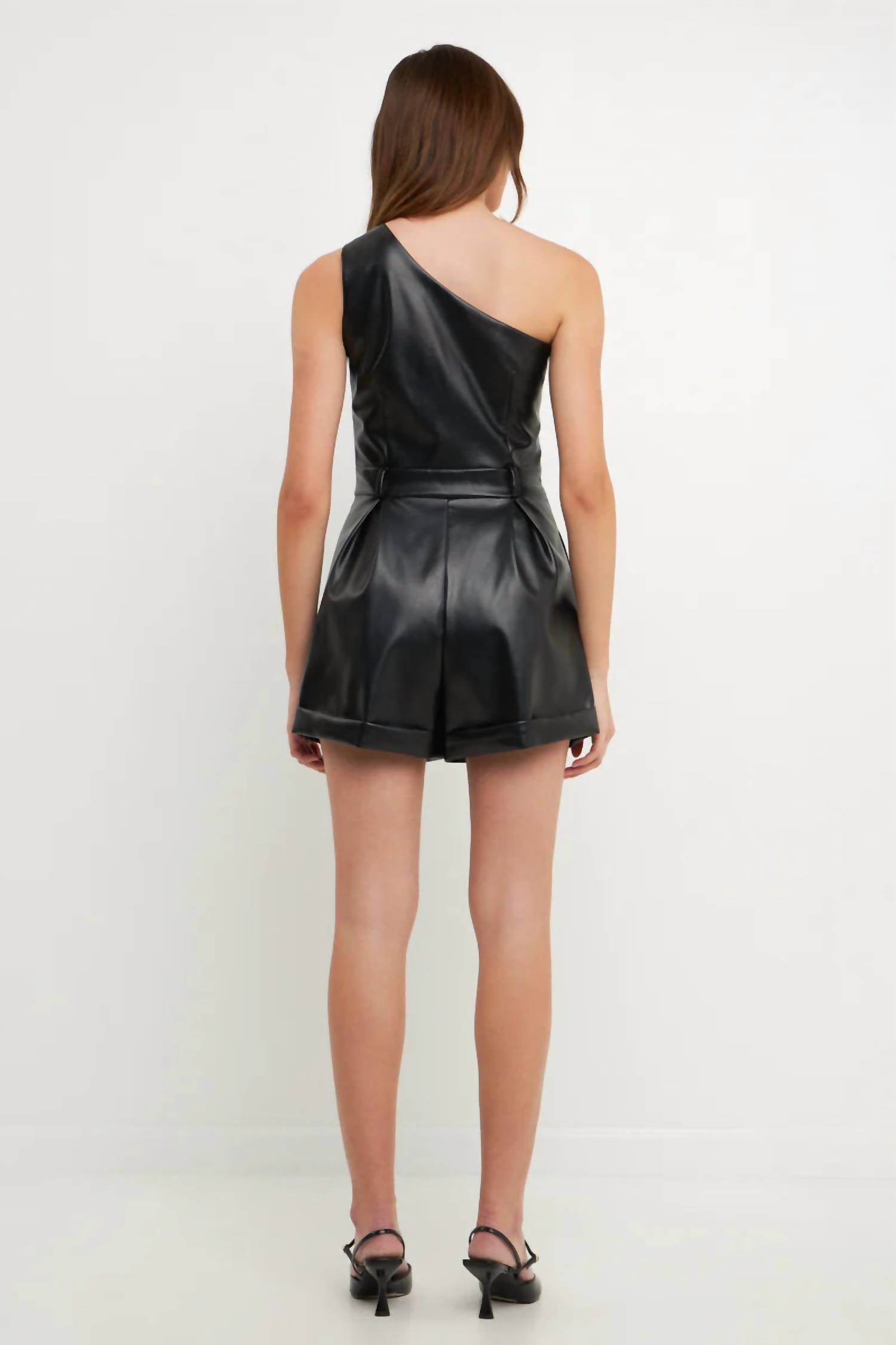 The perfect outfit choice when you you need something quick to throw on and still want to look efforlessly cool. Elevate your ensemble with the Faux Leather One Shoulder Romper by endless rose, a striking piece in black for those standout moments. This women's romper features a chic one-shoulder silhouette, cuffed hem, and practical belt loops, alongside the convenience of pockets. Material: Faux Leather. Closure: Zip closure. Care: Dry clean.