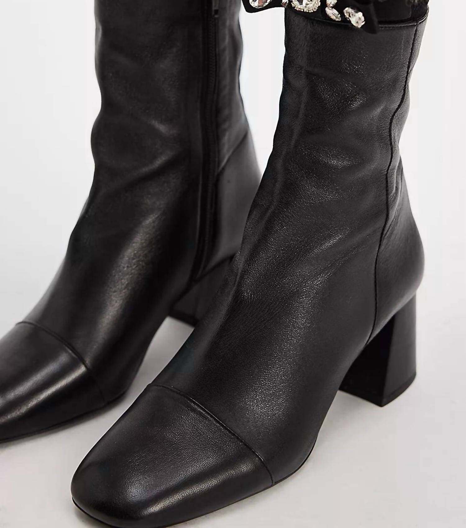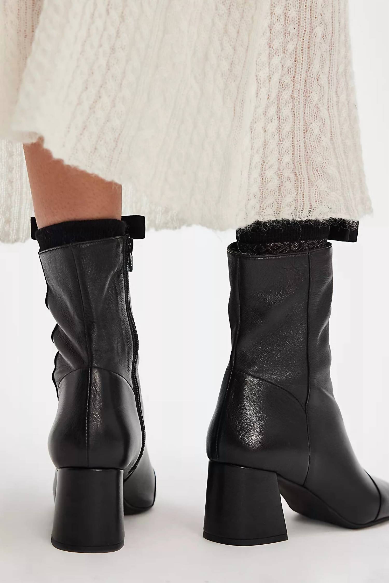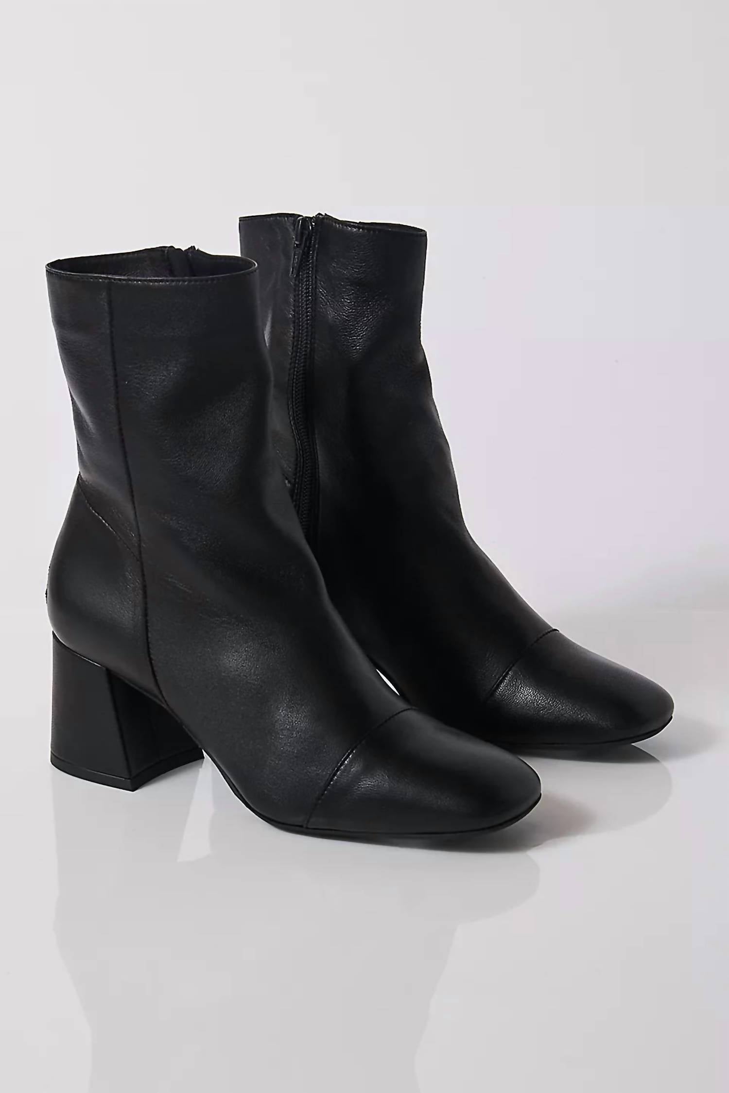 Crafted in black pebbled leather for a sophisticated finish. These ankle-length booties feature a chic square toe and a flared block heel, offering both elegance and comfort. A convenient inner ankle zipper ensures easy wearability, while the seamed details add a touch of intricate design. Made from quality leather and rubber, they are perfect for year-round elevated outfitting.