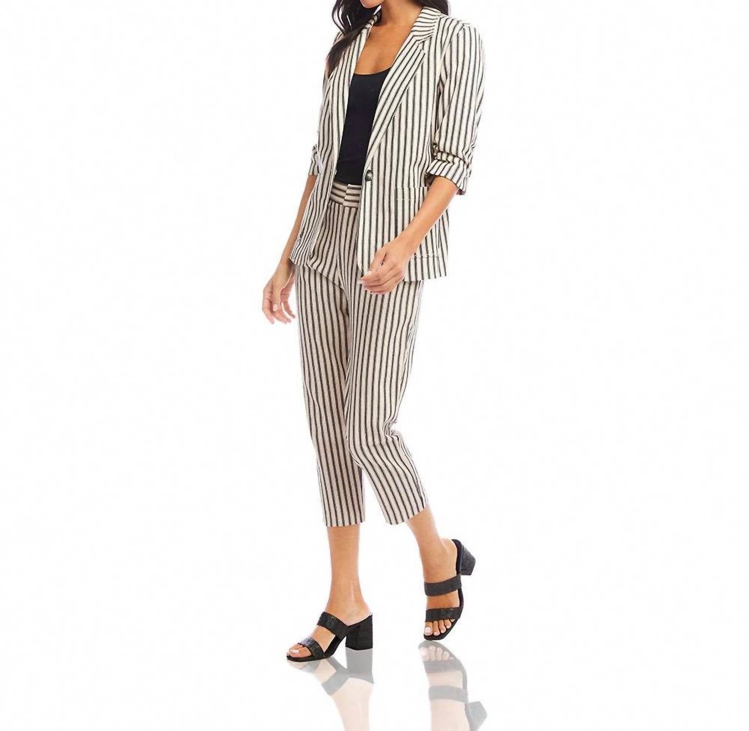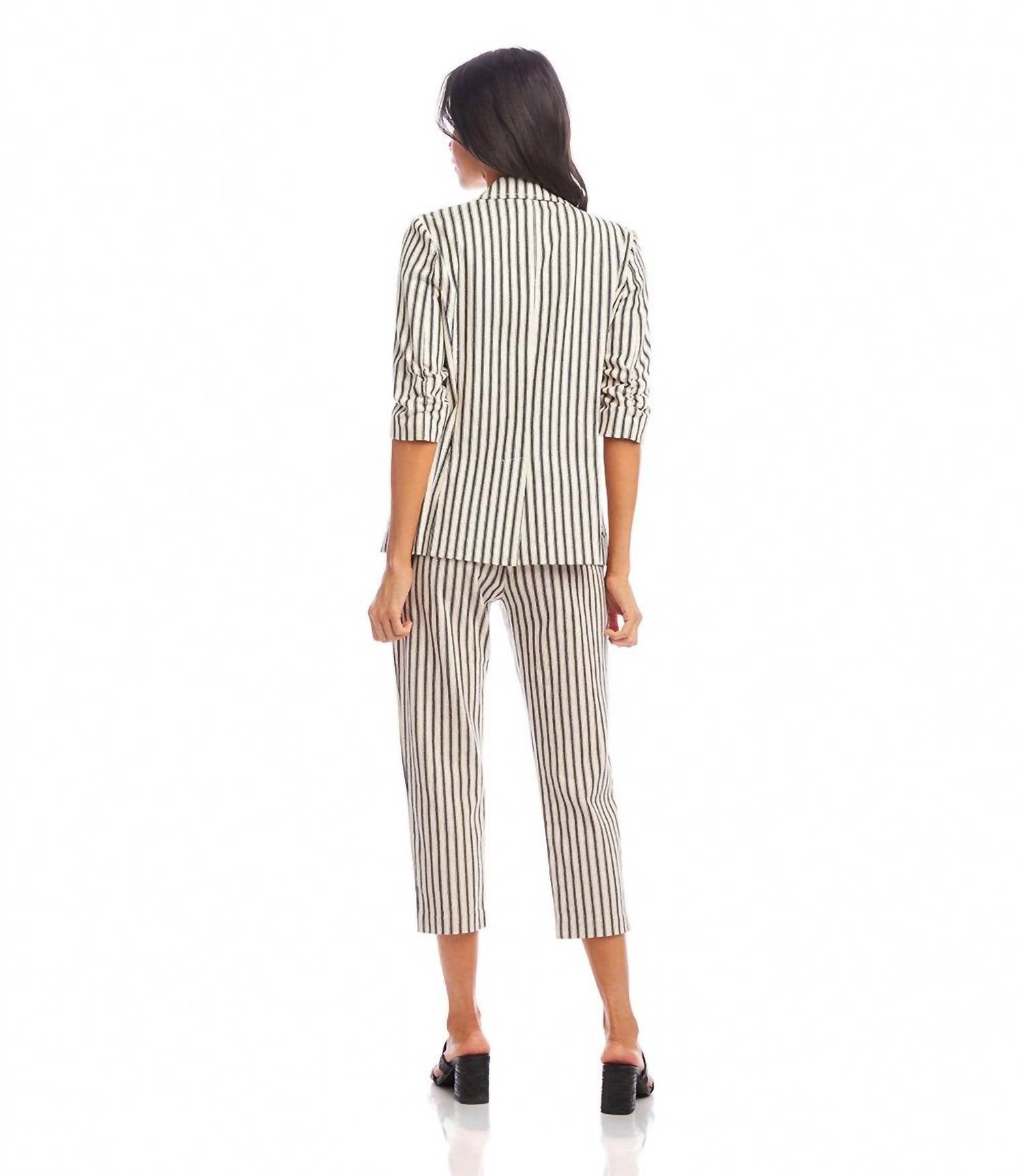 Tailored to perfection, this blazer will be your go-to jacket for years to come. Elevate your style with the Karen Kane Ruched Sleeve Jacket, a chic addition to any wardrobe. This women's blazer features three-quarter sleeves and is crafted from a high-quality 98% Cotton and 2% Spandex blend, offering a comfortable fit. Designed in a sophisticated Stitched Stripe pattern, this imported jacket is perfect for transitioning from workwear to festive occasions. It measures 25 7/8 inches in length for size M and boasts a front button closure, making it a versatile piece for any season. For maintenance, hand wash cold separately and line dry or dry clean.