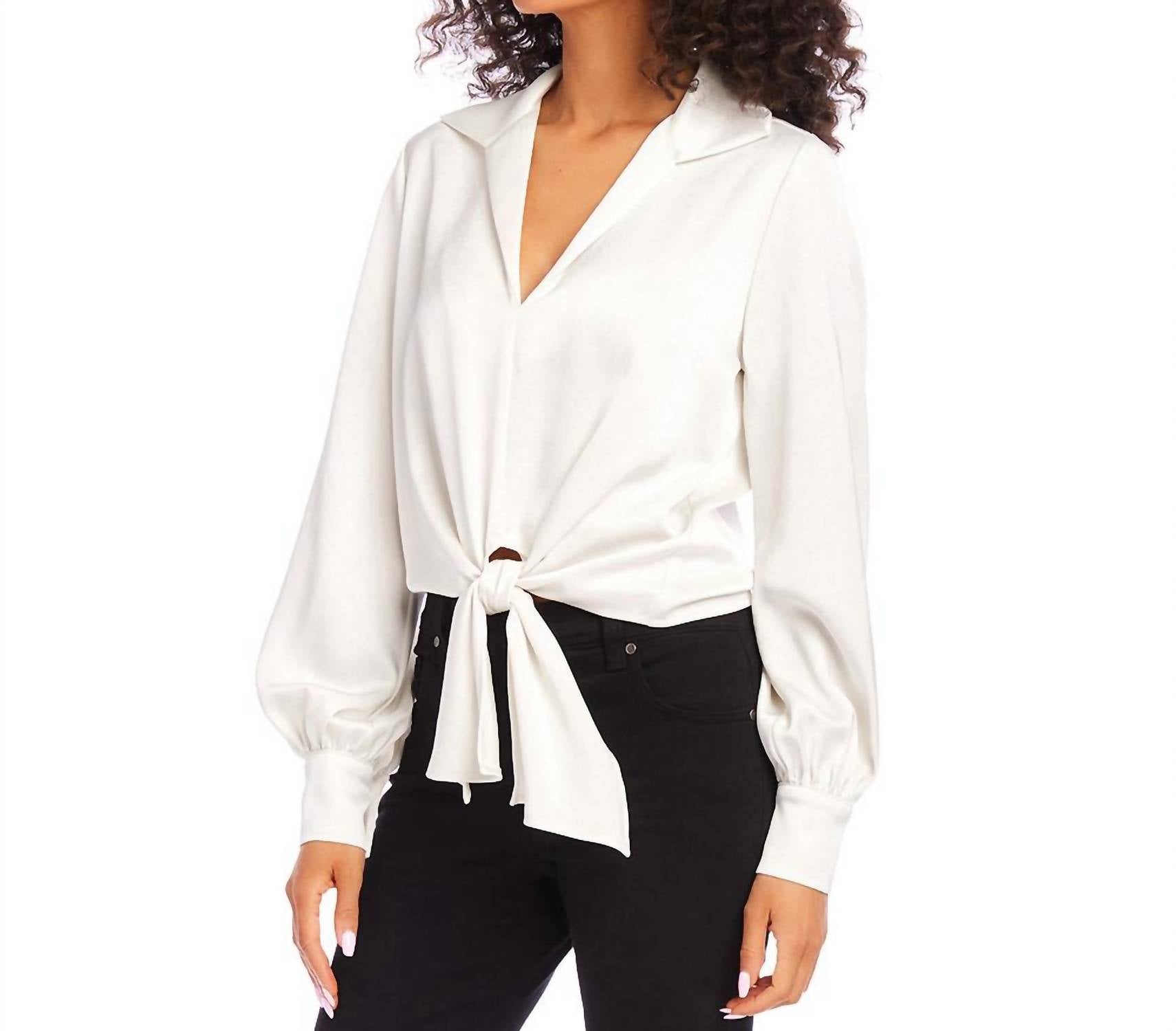 A timeless blouse that will never go out of style. Introducing the Karen Kane Satin Tie Front Top in elegant cream, a sophisticated addition to your wardrobe for both office elegance and evening allure. Crafted from 55% recycled satin polyester, this imported blouse features long blouson sleeves with pleated cuffs for a touch of drama. With a pull-on closure and a collared neckline, it measures 21 1/4 inches in length for a flattering fit. To maintain its luxurious quality, hand wash cold separately and hang to dry or opt for dry cleaning.