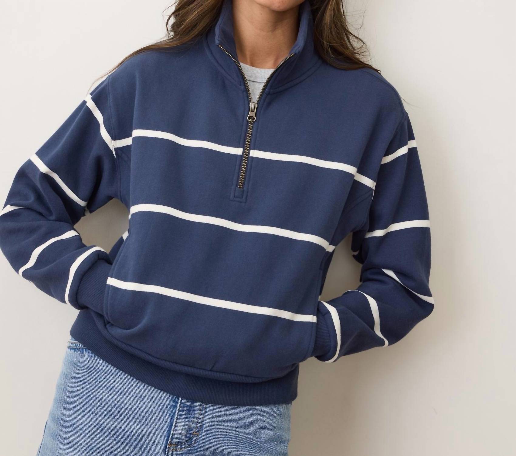 Cooler temps call for layering and we love this adorable sweatshirt for all the obvious reasons. Discover the Cloud 9 Fleece Half Zip Sweatshirt by Marine Layer, crafted for comfort and a stylish edge. This women's long sleeve sweatshirt in classic Navy/White Stripe is made from a plush cotton blend of 80% cotton and 20% polyester, offering a relaxed fit with a full length. It features a convenient zip closure and is made responsibly in China. For easy maintenance, simply machine wash cold and tumble dry low.