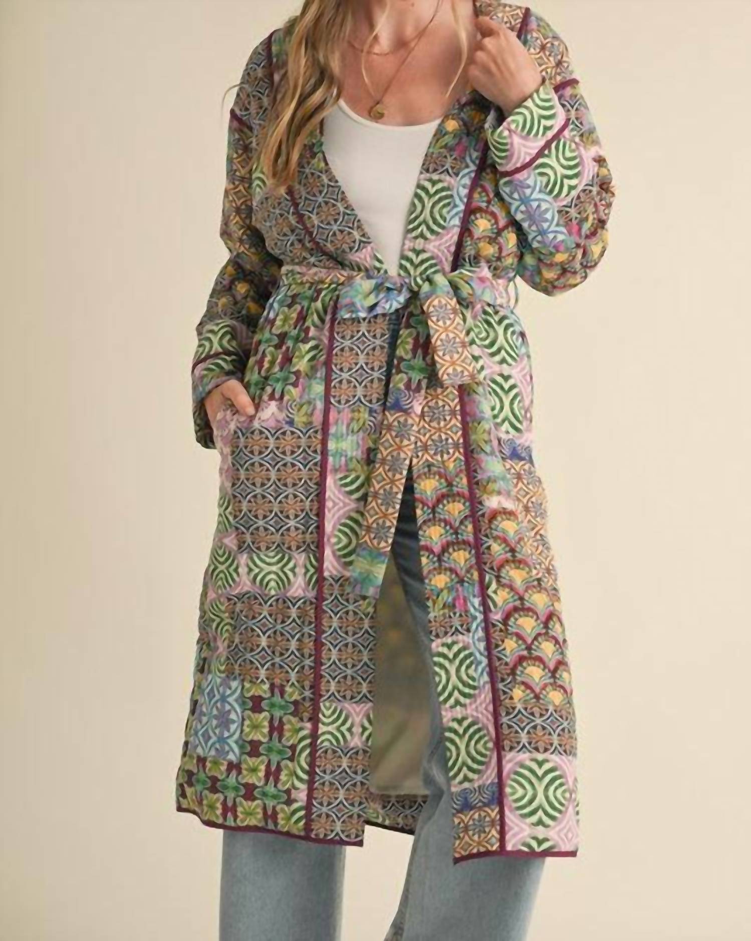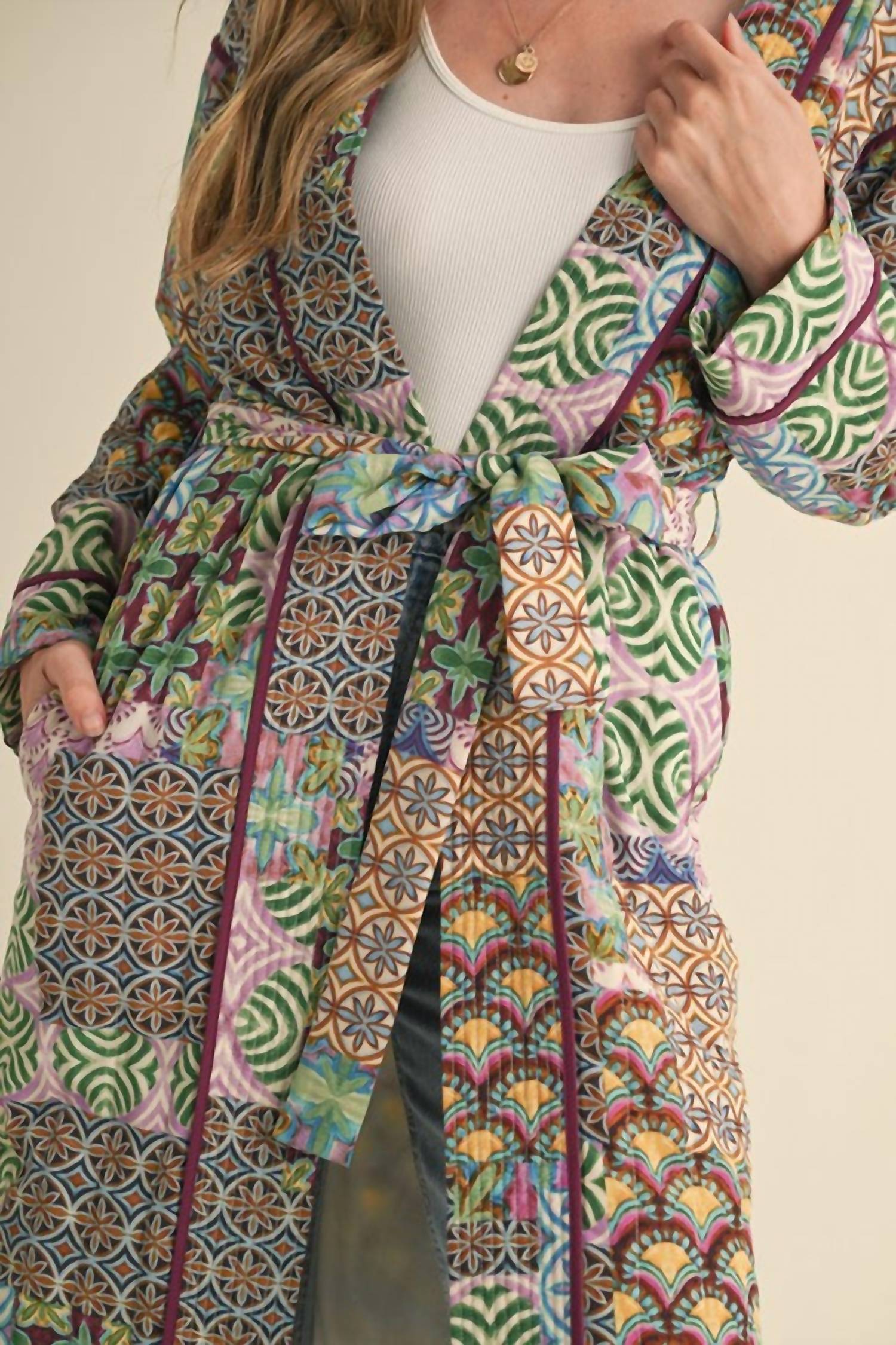 A jacket so versatile you can literally wear it with anything. Introducing the &Merci Patchwork Print Long Jacket, a bold statement piece designed for effortless vacation style. Featuring long sleeves and a unique tie closure, this multicolor jacket is crafted with a relaxed fit and drop shoulder for a boho-chic look. Ideal for fall and Thanksgiving occasions, this jacket boasts an exclusive patchwork pattern and functional pockets for added convenience. Elevate your casual wardrobe with this versatile layering piece, perfect for making a stylish impression.