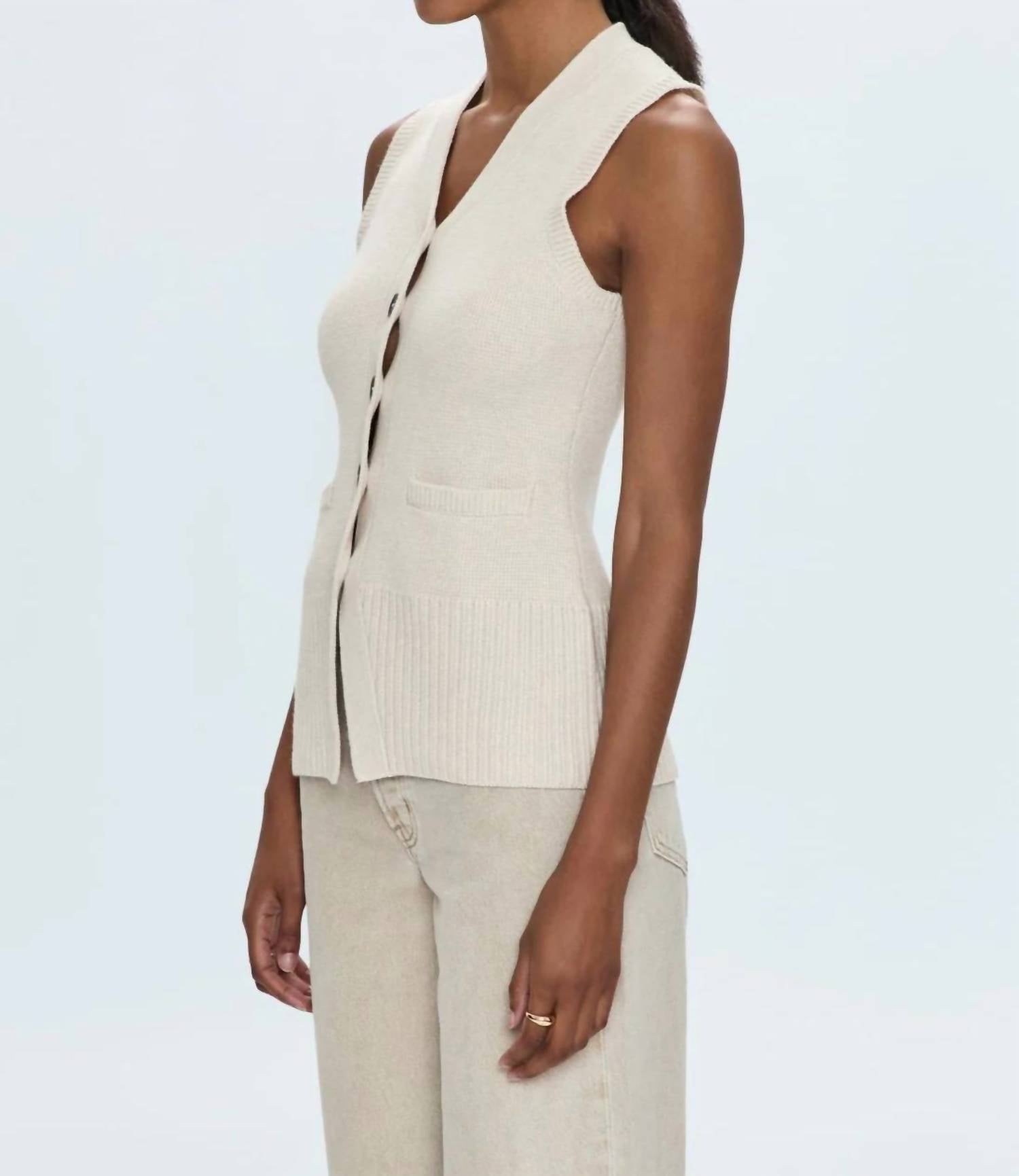 This cardigan will be a sweater-rotation favorite. Presenting the Audra Vest Cardigan by PISTOLA, a textured essential in elegant Soft Dove. This sleeveless design features a high vee neck and a unique splayed hem, crafted from a luxurious blend of 33% Viscose, 23% Nylon, 20% Wool, 20% Cotton, and 4% Cashmere. With a length of 25 inches, this imported button-up vest showcases a center front contrast button detail. Care for this piece by following dry clean instructions.