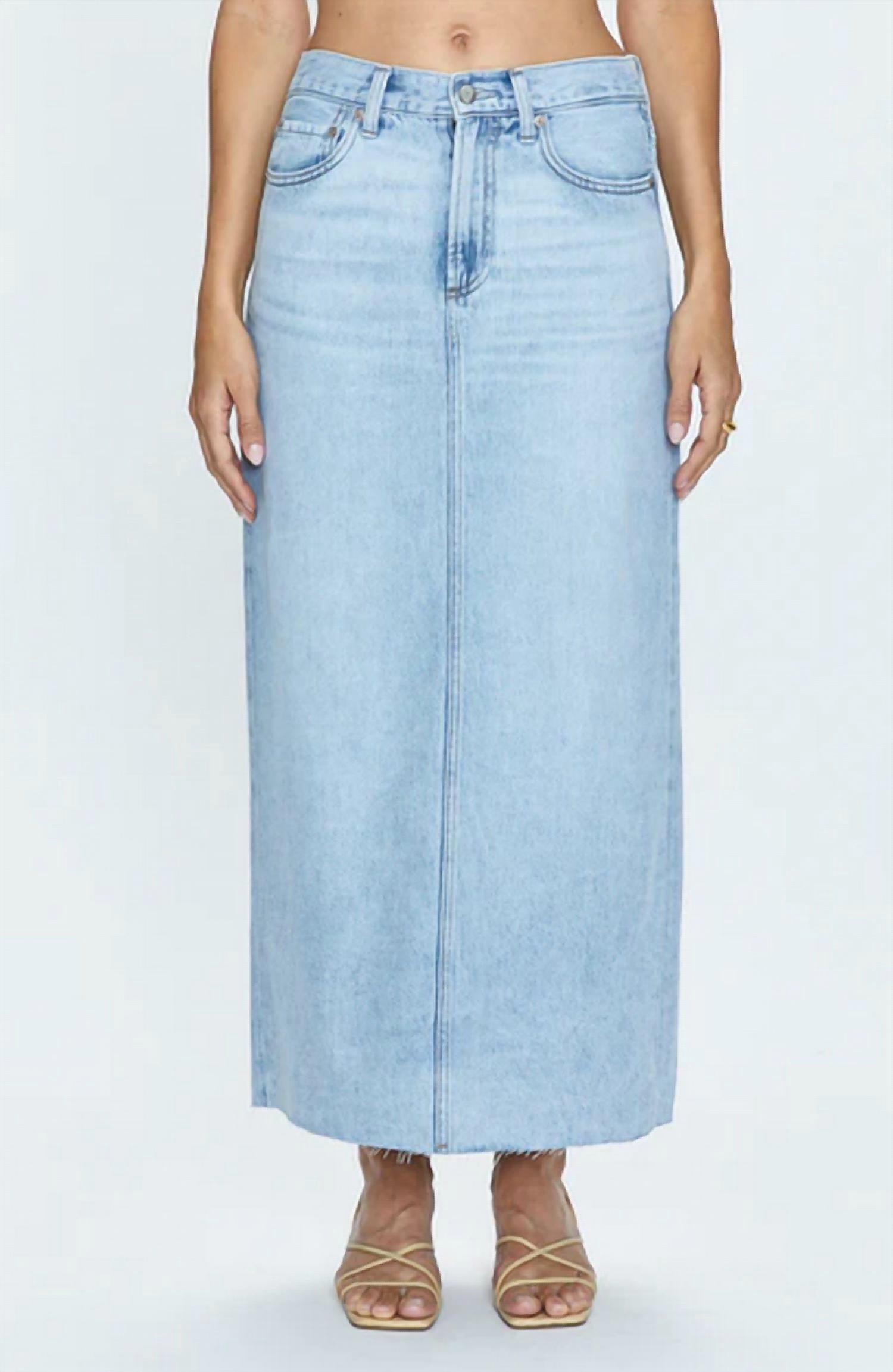 Elevate your casual wardrobe with the Raye Denim Maxi by PISTOLA, featuring a relaxed silhouette and ankle-grazing maxi length in a Jardin light blue wash. Made from a blend of 62% cotton and 38% lyocell, this non-stretch denim piece is crafted in Colombia for a perfect unfussy fit. The skirt includes a raw-cut hem, zip fly with button closure, and convenient 5-pocket styling. Care is simple with machine wash instructions, while dimensions range from approximately 43 cm at the shortest hem to 99 cm at the longest.