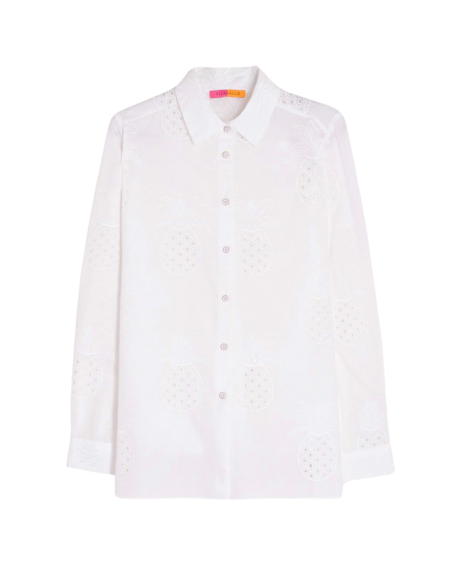 Introducing the Tea Pineapple Eyelet Shirt by Vilagallo, a playful addition to any wardrobe. This women's button-down shirt features long sleeves with cuffs and charming embroidered pineapples throughout. Made from 100% cotton, it offers both comfort and style in a textured pattern. Crafted for church outings or Mother’s Day, this piece effortlessly aligns with fall workwear trends.