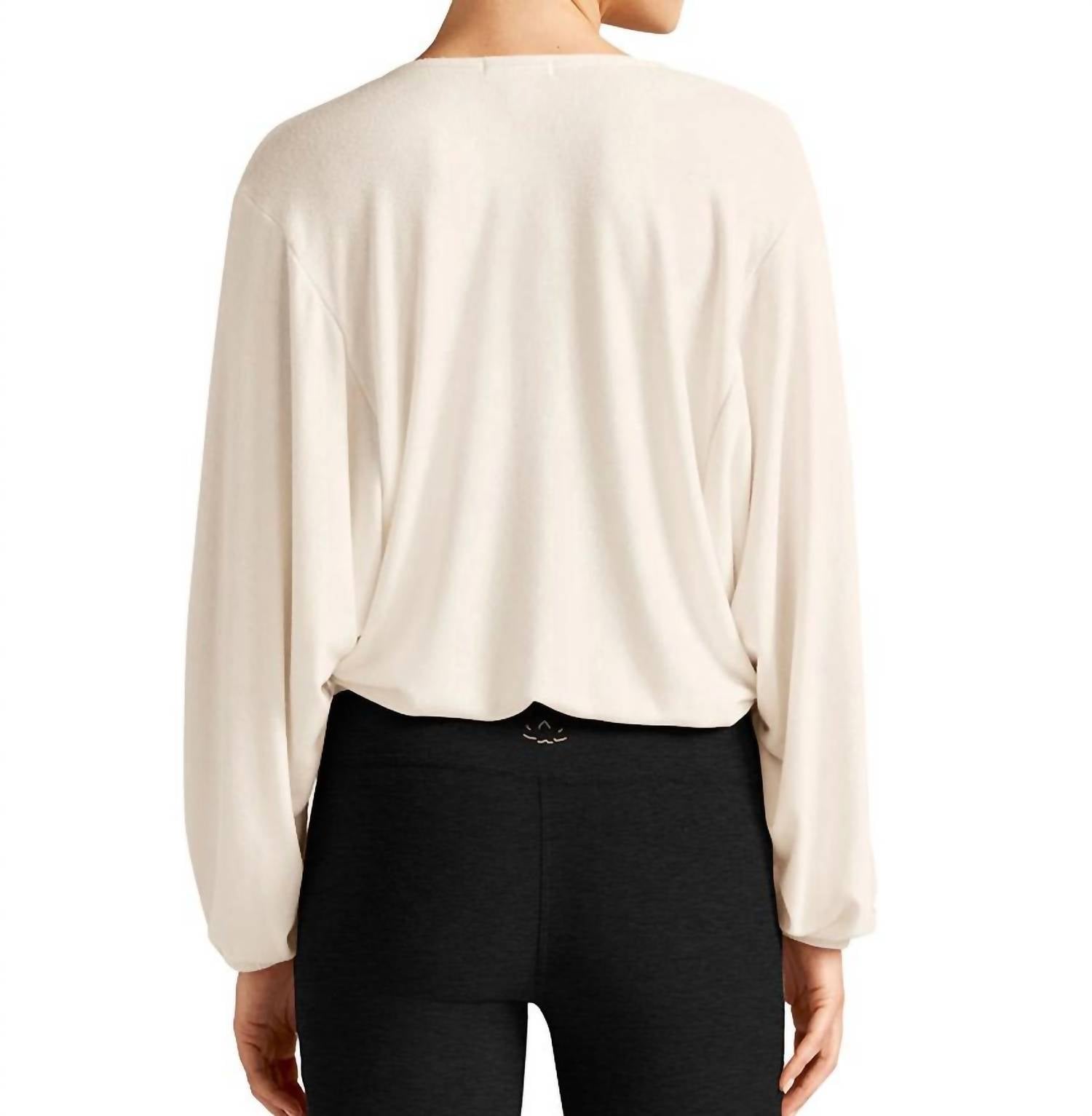 You'll be reaching for this comfy and classic v-neck sweater all season long. Elevate your seasonal wardrobe with the Wrapped Up Pullover Top by BEYOND YOGA, a must-have in snowy white. This long sleeve top is crafted from a plush blend of 47% Rayon, 47% Polyester, and 6% Spandex, ensuring both stretch and comfort. The garment features a stylish crossover front with a relaxed fit and measures 22.5" in length, made right here in the USA. Designed with a V-neckline and elasticated hem and sleeve, this solid pattern piece offers effortless pull-on styling for a chic, laid-back look.