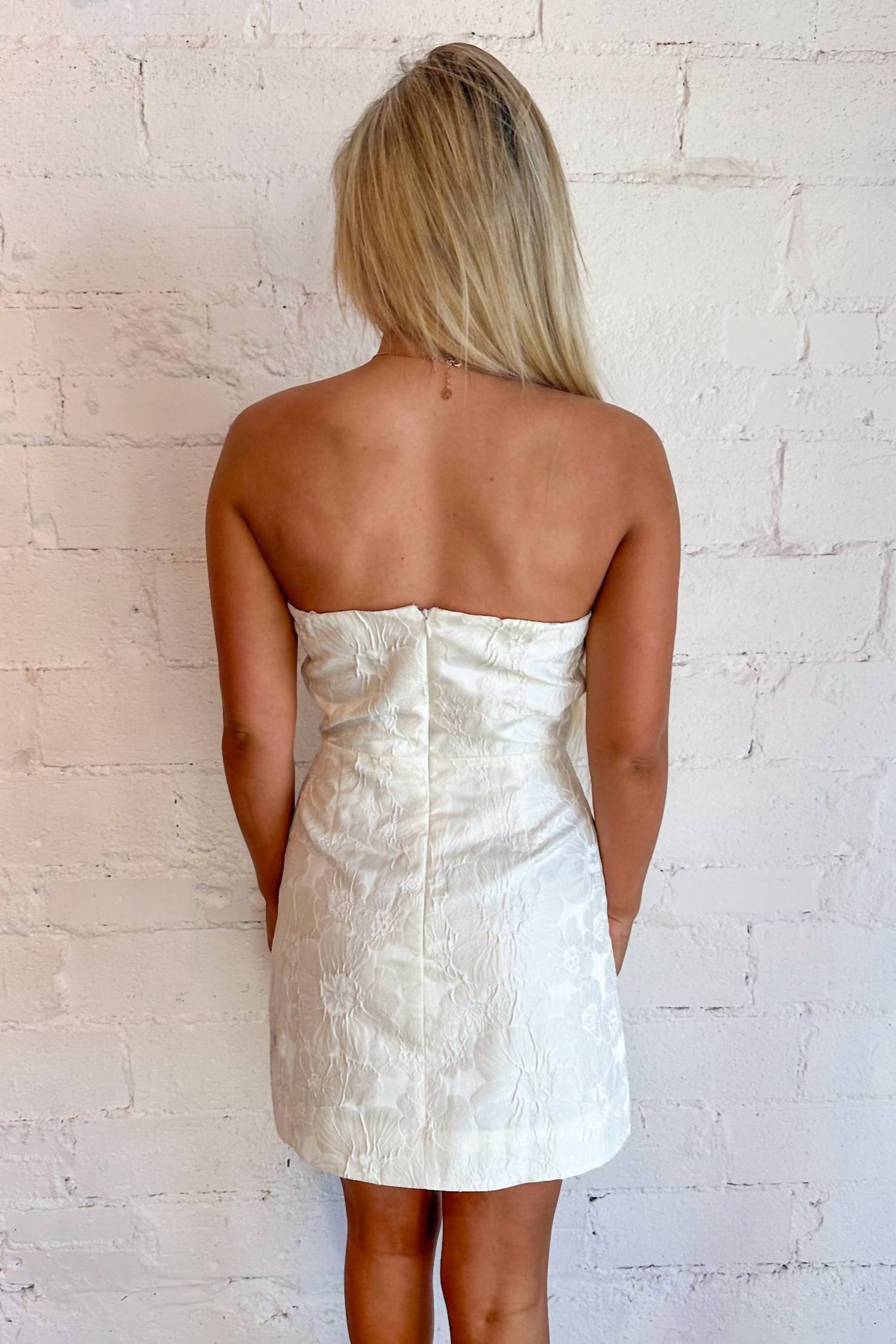 A short and breezy dress for those warmer days. Elevate your spring ensemble with the Floral Puzzle Mini Dress by Day + Moon, designed for quiet luxury and charm. This strapless mini dress features an A-line silhouette accented by a vibrant floral pattern on 100% polyester. Closure: Zip closure. Care: Hand wash cold, hang dry, do not tumble dry.