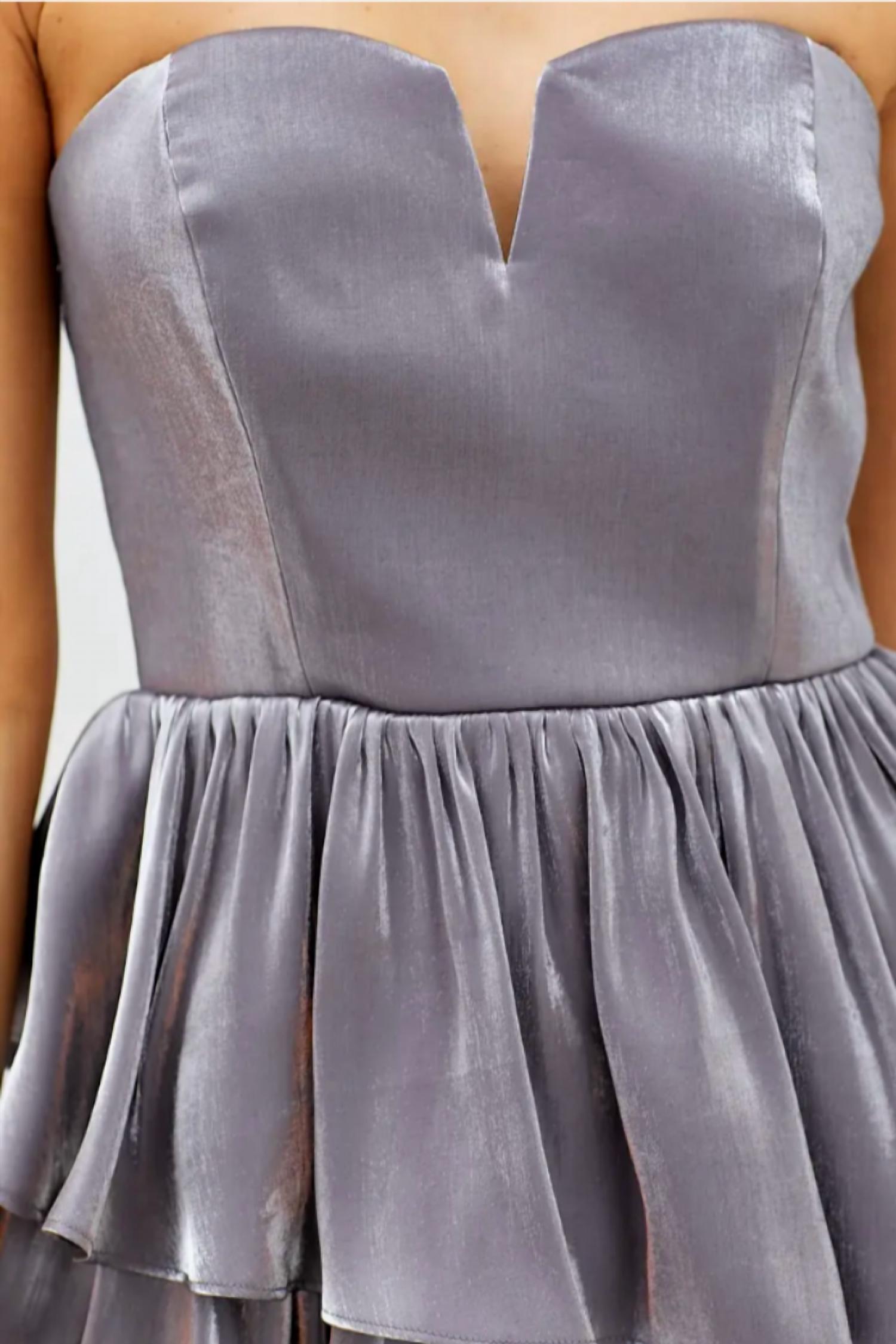 The kind of easy and flattering dress you'll be reaching for all season long. The DO+BE Open Shoulder Ruffle Mini Dress in Gunmetal offers an alluring strapless design with feminine ruffled detailing for a touch of elegance. Crafted in an A-line silhouette, it features an off-the-shoulder neckline, perfect for making a statement on any special occasion. This solid mini dress is versatile, with a discreet zip closure for easy wear. Model wears size S, standing at 5'9" with measurements 32-24-34.