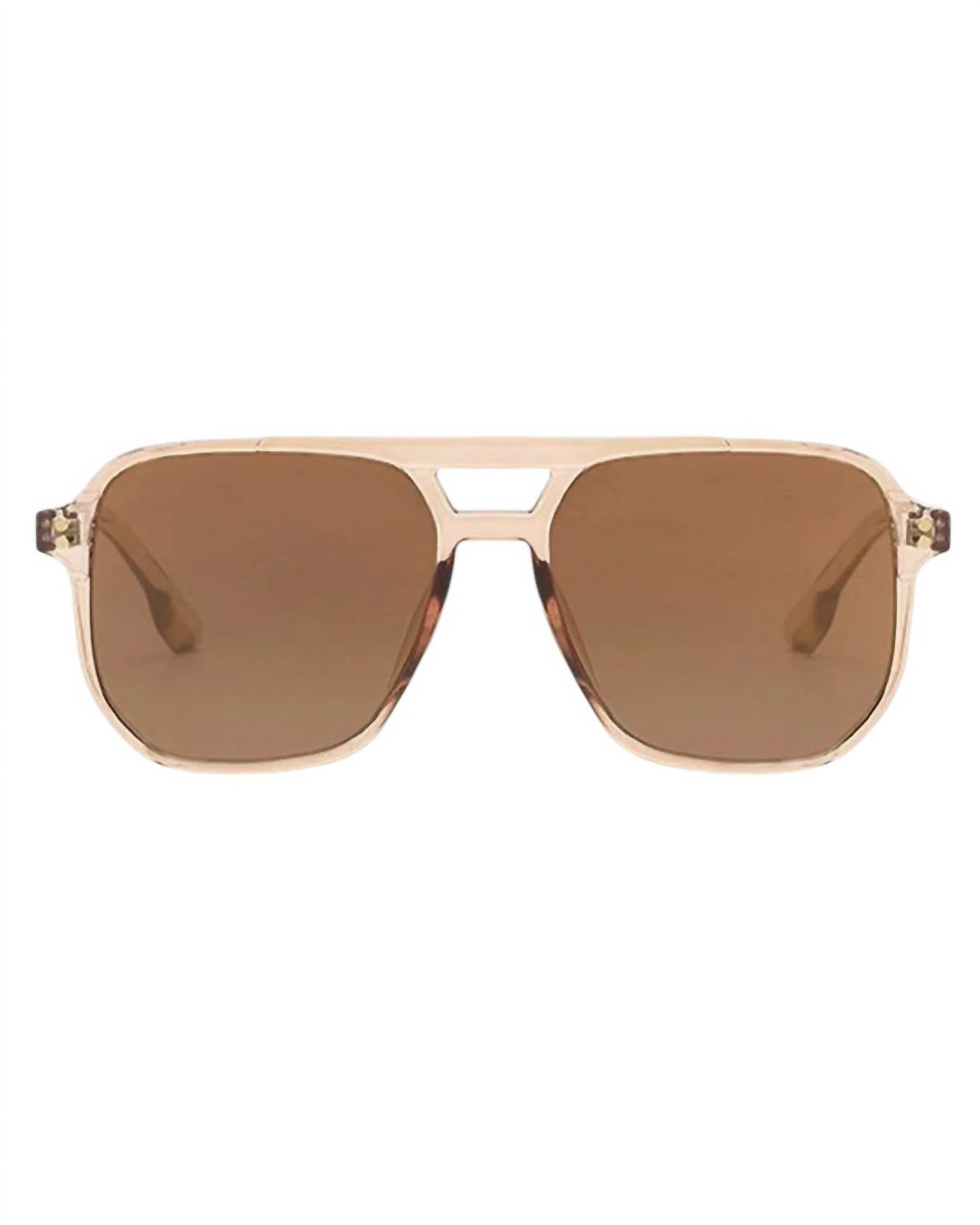 Introducing the Women's Skye Sunglasses by Fifth & Ninth, offering a sleek aviator frame in a chic champagne hue. These sunglasses provide excellent lens protection with 100% UVA and UVB coverage. Equipped with high-quality materials, they ensure durable wear while looking effortlessly stylish. Lens dimensions measure 55mm, with a 20mm bridge and 145mm temples, perfect for modern fashion aficionados. Includes a transparent travel case for convenient storage.