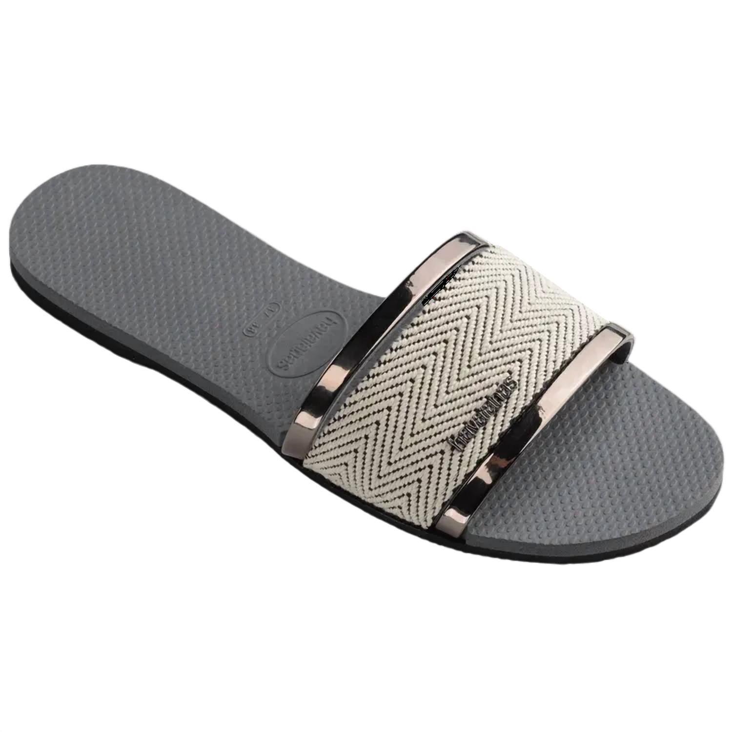 Classicly cute and all-day-wearable. We love this sandal. Step into sophistication with the Women's You Trancoso Premium Sandal by Havaianas in stylish Steel Gray. This slide-style sandal offers unmatched comfort with a cushioned footbed featuring a textured rice pattern, combined with a durable rubber flip flop sole. Crafted with a metallic rubber and fabric upper, it exudes elegance with an added metallic logo detail. Made in Brazil, these sandals are the perfect blend of luxury and ease for every occasion.